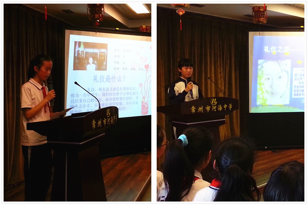 “寻找校园文明礼仪之星”活动在我校开展得如火如荼,学校也对每班评出的“校园文明礼仪之星”进行了表彰,七(6)班周欣源、八(5)万佳代表“文明礼仪之星”作了自我展示。相信通过这样的活动,我们一定会牢牢记住:文明根植于我们的内心,付之于我们的行动。