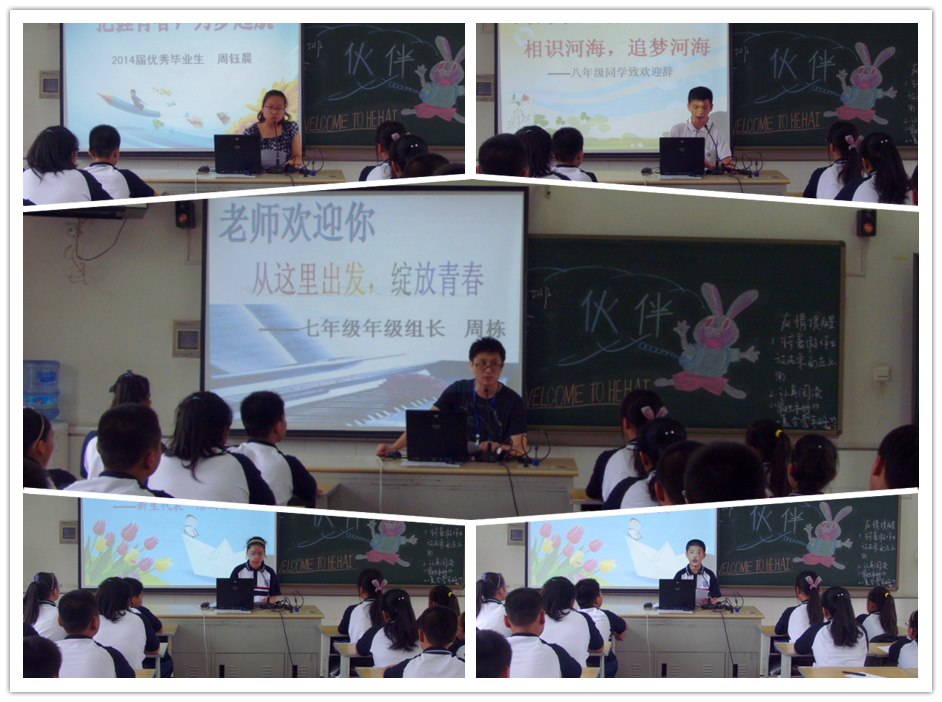 服务团的学长对我们发出诚恳真挚的欢迎,老师们也对我们进行讲话,向我们更加深入的介绍河海中学,让我们更加了解。然后便是考入省中的优秀毕业生的发言,让我们尽快适应初中生活的节奏,在学习方面更是句句箴言,可真是金玉良言啊,也希望我们在初中生活中能更快改正自己小学的沉痼,更快进入状态。