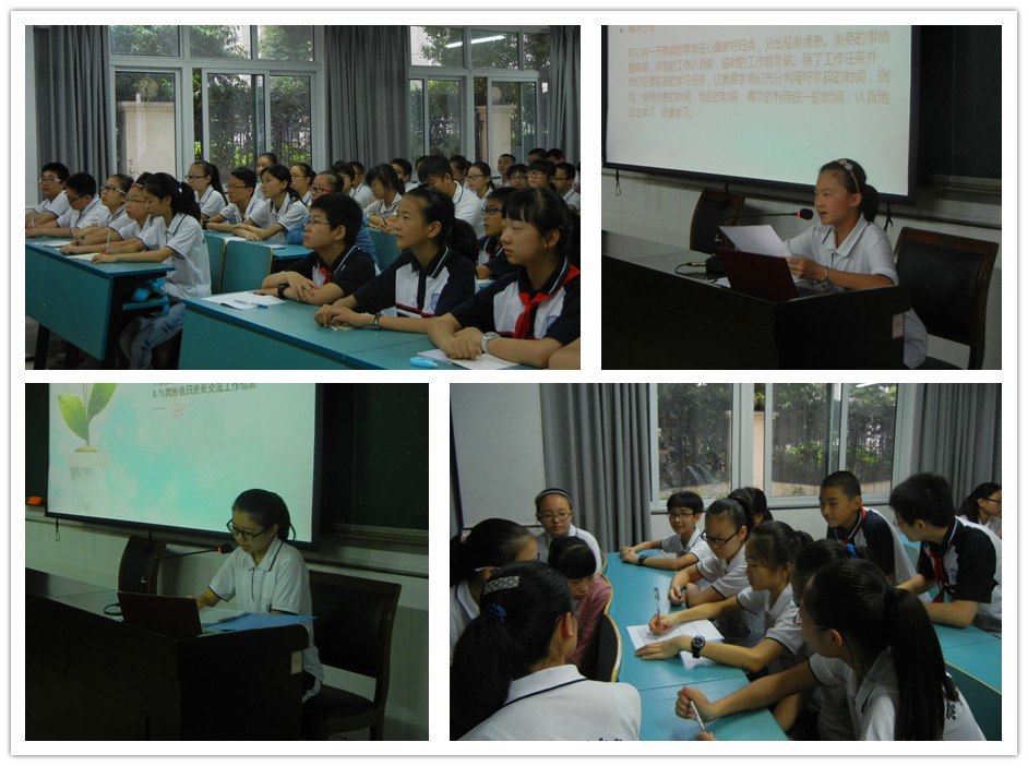 首先,学生干部们观看了教育视频《与责任对话》,了解了中国航天第一人——杨利伟的奋斗历程与人生感悟。他淳朴而真挚的语言,让同学们感受到了航天事业的伟大和艰辛,还有对“责任”二字的感叹和敬畏。接下来,五位学生干部代表作交流发言,他们真诚地讲述了自己工作中的烦恼也慷慨地分享了智慧的经验:班长要学会巧妙地处理繁琐的日常工作也要时刻保持阳光的心态,冷静的头脑;值日班长要做到抓好每一个细节,值好每一班岗,做尽职尽责的班级管家;学习委员不仅要在学习上成为大家的榜样,更要在实际行动中“有所为”并且“有所作为”;值周班长既要有自己的工作原则,也要有灵活的处事办法;劳动委员应细化劳动责任分工,全方位地做好班级卫生工作。紧接着,进入小组讨论环节,在思维与语言不断地碰撞中,针对一个个工作难题,一个个金点子迸发而出。可见,在平日的工作中,班干部们都能做到多动脑,勤反思。最后,教导处芦主任为学生干部们做真情指导,他用生动鲜活的事例向同学们全面地展示了一名班干部所肩负的光荣与责任,并向大家提出了快乐服务、主动谋划、智慧工作的希望。同学们专注地聆听,详细地记录,着实受益匪浅。