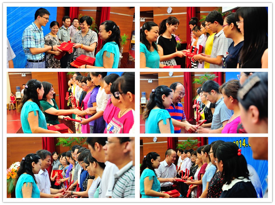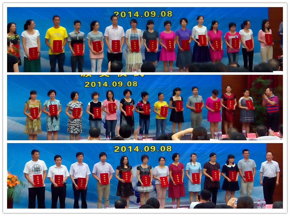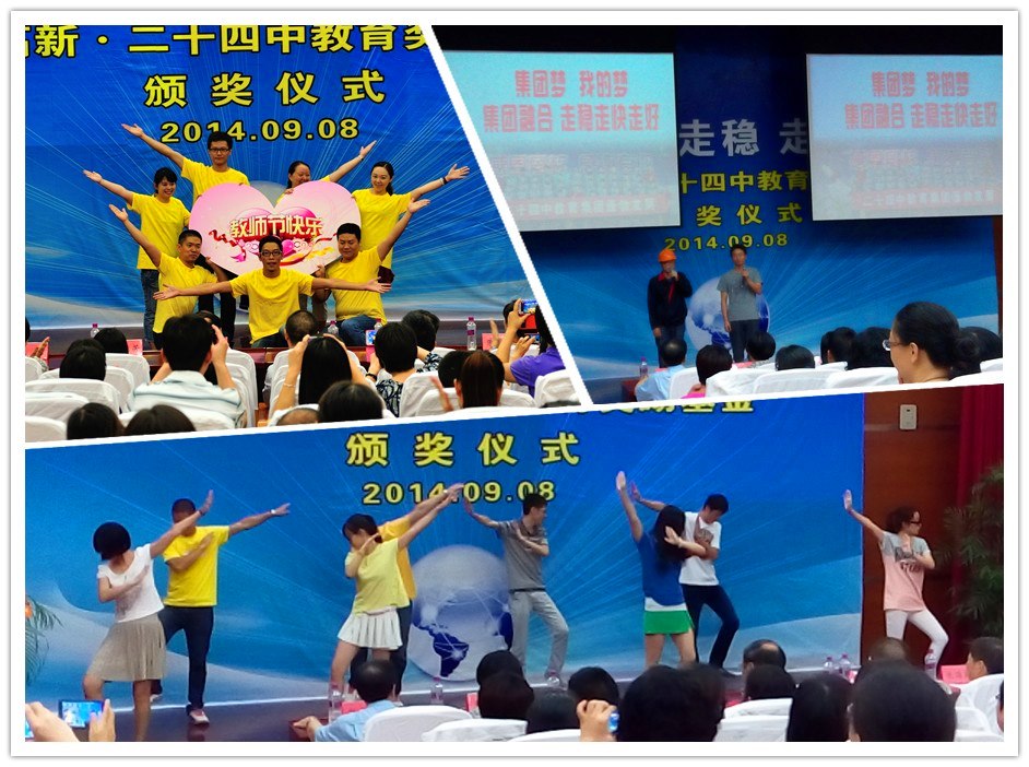 教师节目精彩助兴 表彰会期间,三校区的老师们也纷纷施展自己的才艺为表彰会助兴,一次次将会场氛围推向高潮。核心校区的音诗画《千手观音》将耳熟能详的网络红曲改编,给老师们送上真挚的问候;惟妙惟肖的千手观音别有韵味,再现了老师们的聪明才智。天宁分校的小品《加班》,源于生活,贴近梦想;短小质朴的情节,幽默风趣的语言,说出了学校集团融合的新局面。河海中学的《歌舞青春——与河海共成长》,一曲《光阴的故事》唱出河海中学与二十四中教育集团的成长历程;一首《小苹果》跳出常高新与二十四中教育集团发展火红的未来。