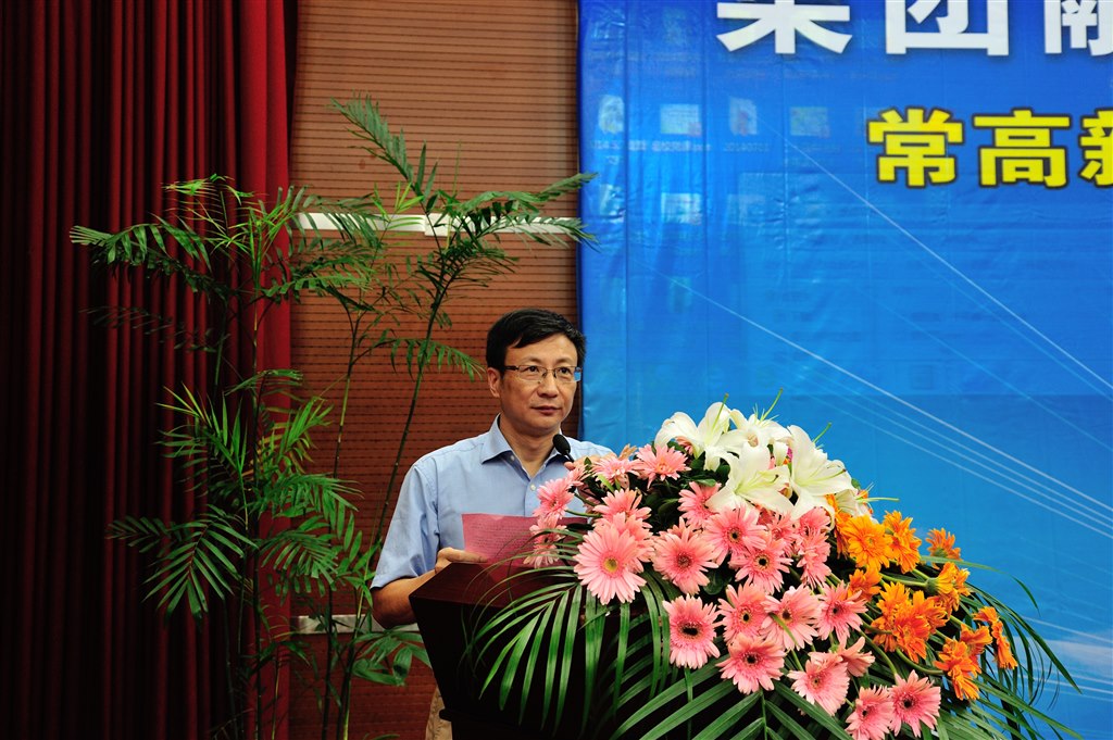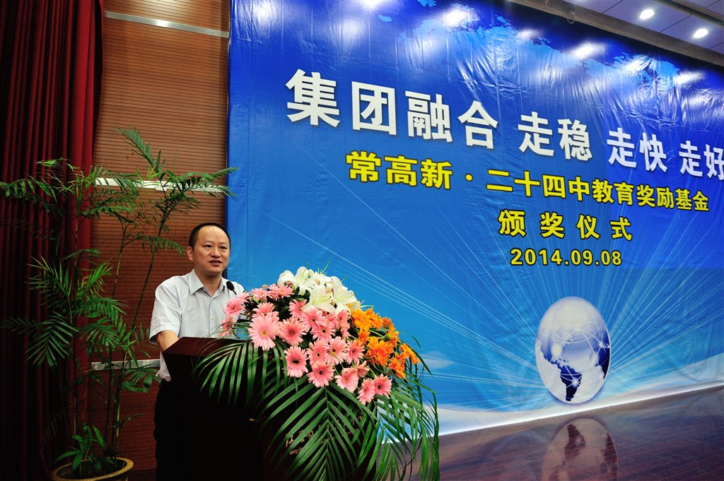 领导致辞鼓舞干劲 首先,赵卫勇校长、蒋顺国校长、赵敏慧执行校长分别致辞。三位校长都回顾了教育集团办学以来所取得的成就,畅想教育集团未来的发展方向。赵卫勇校长尤其强调三校区所有教师应服从集团大局意识,牢记忧患意识,提倡艰苦奋斗的意识,凝聚教育改革,提升教学品质,期待二十四中继续发扬引领作用,河海中学进一步提升发展内涵,天宁分校进一步提升教育品质。蒋顺国校长则期待河海中学不仅是校园内的学校,更要成为全社会的学校;期望所有河海人心中要装着情怀、装着信念、装着理想,踏上追求更高品味教育的梦想之旅。赵敏慧执行校长表示将承载常高新集团和二十四中教育集团诚挚的寄托,以河海中学规范办学为典范,不断追逐名校梦,希望老师们提升教育教学水平,实现二十四中教育集团从融合走向共赢之梦想。最后高新区管委会副主任、常高新集团党委书记金立卫先生发表了热情洋溢的讲话,他给在座的所有老师送上真挚的祝福并对他们的付出表示感谢,希望二十四中教育集团支持新北教育,希望二十四中教育集团三校区稳步提升,办成人民满意的学校,希望常高新与二十四中教育集团融合成一个大家庭,永远是“相亲相爱的一家人”。