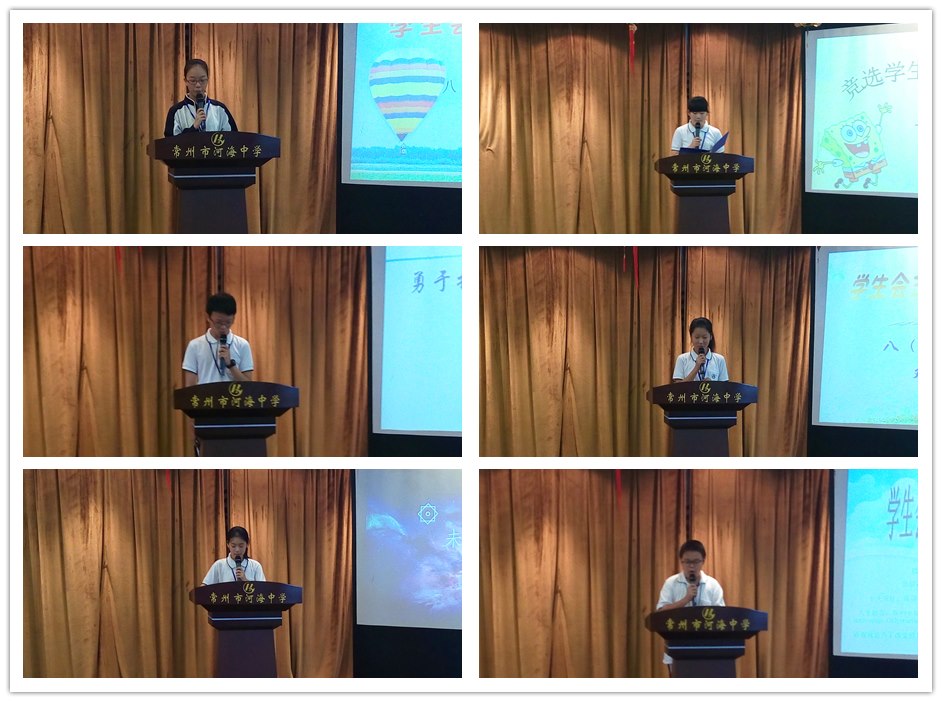 首先,由第六届学生会主席程安对一年来的学生会工作做总结。从中,我们看到了学生会干部的成长与进步,也看到了他们努力一年所取得的丰硕成果。接着,竞选学生会主席的六位学生按抽签顺序发表竞选演讲。自信率真的他们各有特色,各具魅力。肖婉淑同学的从容自如与处女座的完美精神、贾钰同学的信心满满和特有的说服力、张锐同学的沉稳睿智与脚踏实地、邓淇同学的幽默风趣与乐观自信、郭颖同学的甜美大方与努力进取以及周健同学的阳光向上与真诚付出,无一不给全校师生留下了深刻的印象。最后,经过公平、公正、公开的投票与唱票,八(5)班的邓淇同学获得最高票数,成功当选为河海中学第七届学生会主席。教导处戴亚萍主任为她颁发聘任证书。捧着沉甸甸的证书,邓淇同学激情发表当选感言,她表示一定会努力服务同学,认真对待工作,创造不一样的精彩。与此同时,上届学生会干部也真情寄语,表达了对新一届学生会工作的期待与祝福。