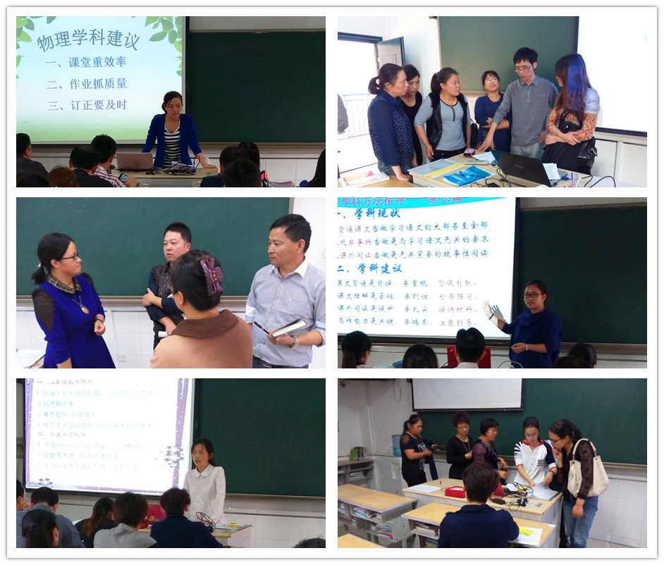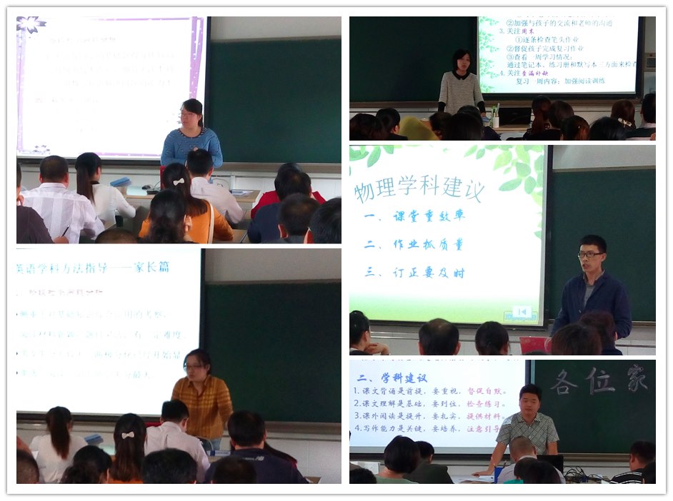 凝聚每份力量——我们齐努力。会议第二部分以班级为单位进行交流。首先,语数英物四门主课老师分别结合学科特点、针对班级情况作了发言,以第一次单元调研为契机分析了目前学生学习的状态,指出了其中的不足,分享了自己的教育心得,希望得到家长的积极配合。其次,各班班主任就开学来班级情况作深入交流。各班的主题立意深刻,内容丰富,如“在‘踏实’与‘勤奋’间行走”、“习惯成就未来”、“目标方法 意志——成功的必要条件”等,一个个主题深入人心;班主任们用精美的PPT与家长一同回顾了开学以来学生的表现,一张张图片展示了努力进取、稳步发展的八年级学生风貌;从理性的视角给家长分析了班级的个性问题及如何进行有效的家庭教育,一条条建议朴实无华。生动的图片、教育的实例、有效的策略,使与会家长听得投入,记得用心。家校合作,凝心聚力,共同为八年级保驾护航!