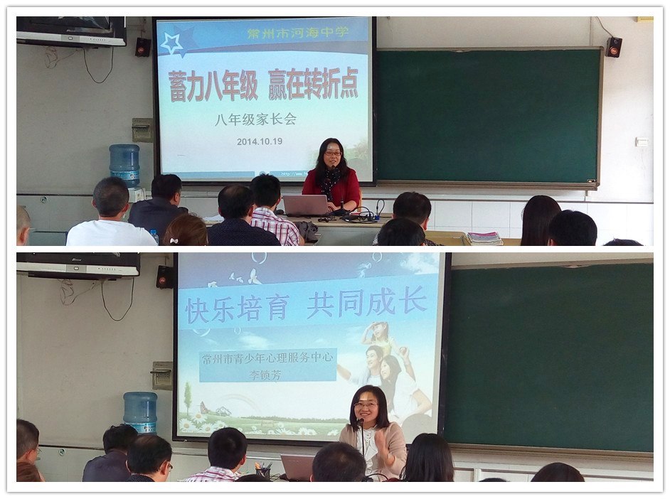 踏上新的旅程——专家来引领。会议第一部分由常州市青少年心理服务中心、常州市第二十四中学李锁芳老师围绕“快乐培育,共同成长”这一主题给八年级家长们带来了一堂精彩的讲座。李老师结合孩子所处年级、身心特点、个性特征等方面分析了八年级的特点,抓住“陪伴与自主”、“批评与表扬”、“言传与身教”这三组关键词与家长们分享了家庭教育的策略。李老师用精彩的案例与生动的图例给家长们支招,家长们也从讲座中收获了很多。