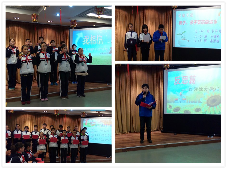 在回顾中总结经验。会上还表彰了上半学期中表现突出的单项奖获得者。获得“进步显著奖”代表七(6)班卞宇凡、八(2)班王倩熙和九(3)班巢雨晴分别交流了取得进步的经验,让人受益匪浅。“优秀从点滴开始”,“成功源于自身的努力”,“进步源于更高的追求”……字字真切,句句在理,相信会有更多的同学向他们学习,以自己的汗水赢得热烈的掌声,以自己的勤奋赢得更多的喝彩。
