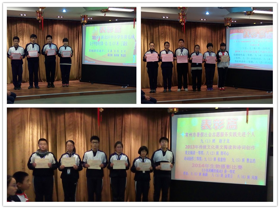 在活动中品味收获。表彰会上向同学们展示了一次次活动的精彩瞬间。集团教育、校外拓展让我们在学习和生活中取得了共赢。天宁分校的小伙伴们来我校的一日体验,让我们结下深厚的友谊;二十四中教育集团的数学挑战赛,让我们勇攀数学的高峰;学校组织社会实践活动,让我们享受实践的乐趣;与河海大学联谊的模拟联合国活动,让我们品尝辩论的精彩……丰富多彩的活动,让我们增长了知识拓展了眼界,也让我们在快乐中成长着收获着。