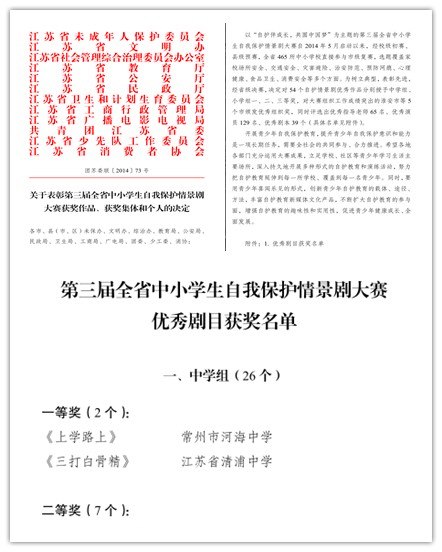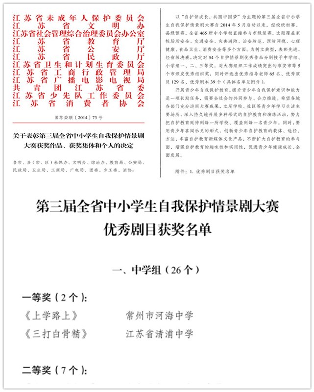 近日,由江苏省未成年人保护委员会、省文明办、省教育厅、团省委等12个部门联合开展的“第三届全省中小学生自我保护情景剧大赛”结果揭晓,河海中学自编自导的情景剧《上学路上》一举获得了省一等奖第一名,八(5)班金莫言同学获优秀演员。
