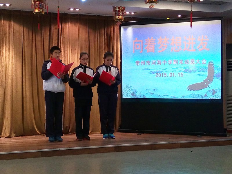 时间的齿轮在不停地转动,梦想的钟声再次敲响,我们迈进了2015年的大门。回首2014,我们携手度过了充实的一学期。为了让同学们树立自信、有效复习、实现最初的梦想,01月15日下午,常州市河海中学召开了“向着梦想进发”期末动员大会。