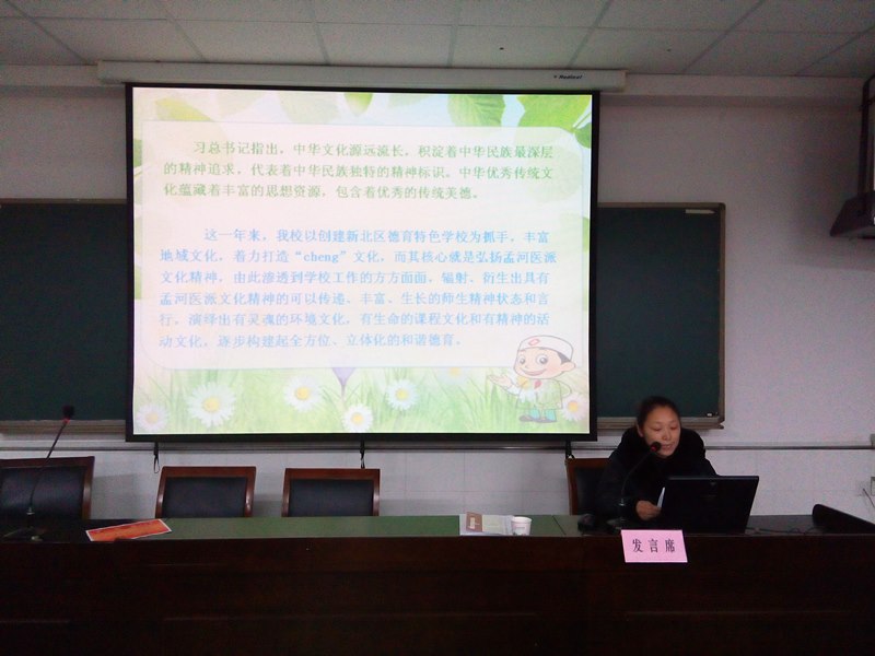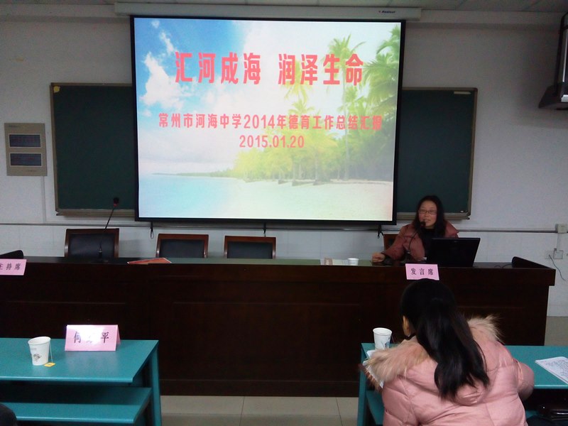 会议首先由孟河中心小学、三井实验小学、河海中学三个单位进行经验交流。我校教导处戴亚萍主任作了《汇河成海 润泽生命》的德育工作汇报。她以“汩汩源泉,凝聚河海力量”、“ 涓涓细流,润泽河海芳草”、“ 朵朵浪花,激荡河海波澜”、“ 滔滔百川,汇助河海希望” 四个篇章,展示了我校2014年在精神文化、管理文化、活动文化、集团文化上的德育成绩。