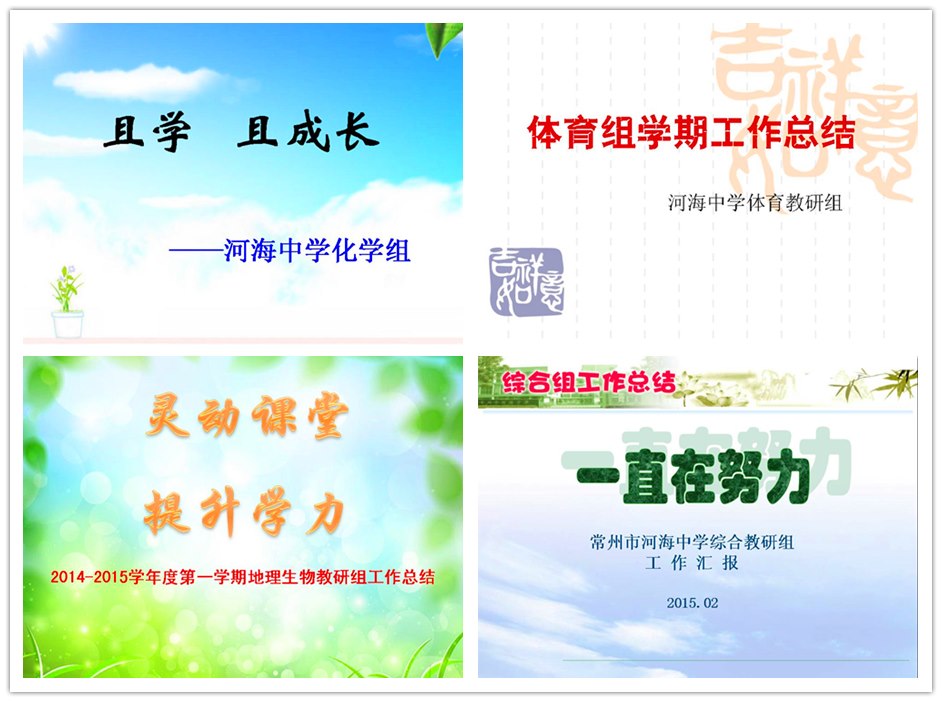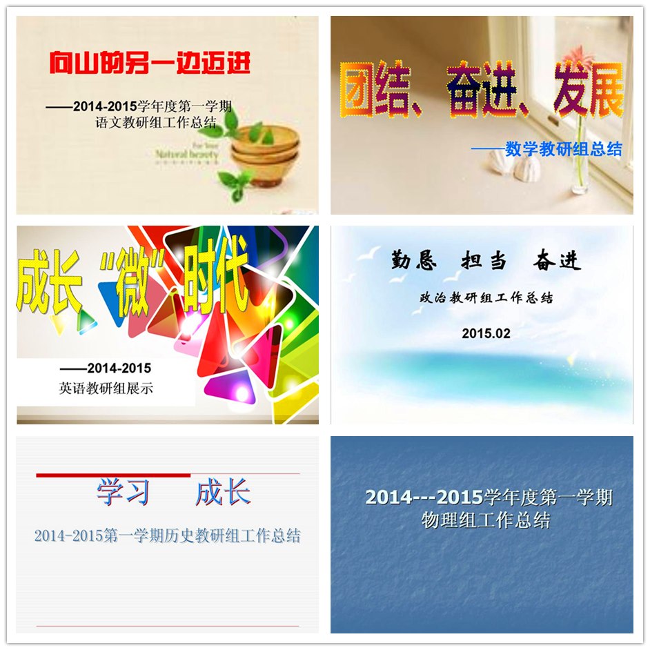 展评会上各教研组组长首先展示了整理好的电子档案,随之配以各具特色的幻灯片,详细罗列了本学期所完成的工作及突出的成绩,尤见各教研组长的精心和用心。语文组各项活动开展地有声有色,精彩纷呈,努力不懈地向着“山”的另一边迈进;数学组团结协作,稳步提升,重教研成果显著;英语组锐意进取,带着微尝试、微视频、微课题、微学案、微特色、微思考走进“成长‘微’时代”;物理组理性思考,踏实奋进,在提高学生学习物理的兴趣及实践能力上苦下功夫;化学组立足整体,教学相长,且学且成长;政治组脚踏实地,勤恳奋进,务实高效有亮点;历史组活力十足,互帮互助,“电子家谱”显绝活;地生组构建灵动课堂,提升学力,百花齐放中创收成果;综合组活动丰富,活跃校园,为彰显素质教育一直在努力。通过交流,加强了组间彼此的深入了解,为同行之间的互助互学提供了平台,拓展了教学研讨的方法与手段。