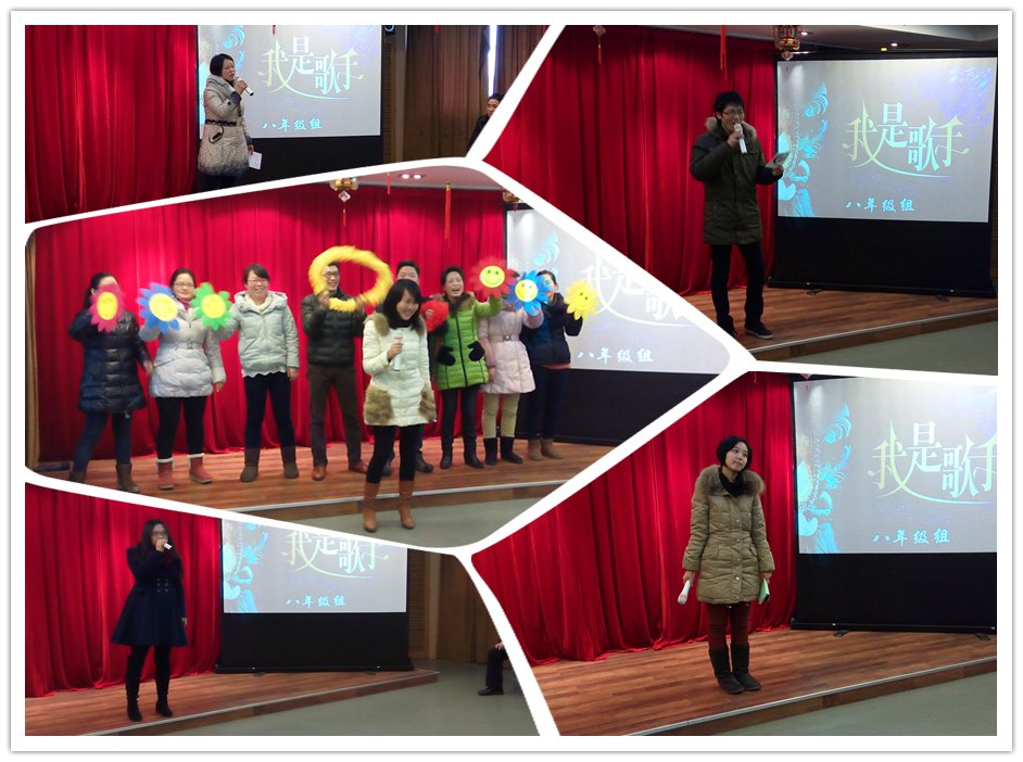 综合组的开场舞《The Fox》,男的豪迈,女的柔媚,舞出了激情,跳出了欢乐。八年级组的《我是歌手》流行歌曲串烧,男声情意绵绵,女声高亢悠扬,唱出了新潮,歌出了梦想。七年级组的小合唱《有没有那么一首歌》,歌词有特色,队形有变化,但依旧唱出了他们的专一,唱出了他们的代言体。九年级组的《小人舞》,幕前五人的搞笑演出,幕后五人的默契配合,带给我们更多的是惊喜与欢乐,原来一向忙碌严肃的九年级也可以如此可爱动人。整个六楼演播室里充斥着爱与感动,久久不愿离去。