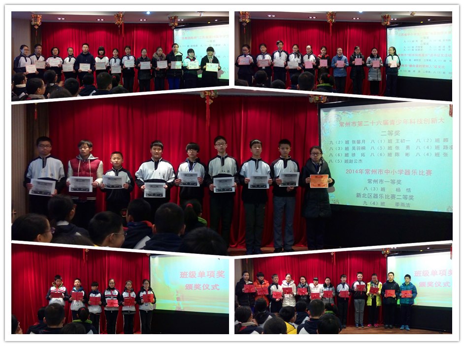 2014年,是充实的一年,一段《2014,我们一起留下的足迹》的短片带领我们回顾这一学期学校开展的各项活动;2014年,是收获的一年,同学们在省市区各级比赛中获得优异的成绩。如在“苏教国际杯”江苏省第14届中学生作文大赛赵珺漪、王鹏妍、房彤获一等奖,另有10人获奖;在江苏省中小学“三爱”书签制作大赛中6人分获一、二等奖;在常州市第二十六届青少年科技创新大赛中共有10人获二等奖……