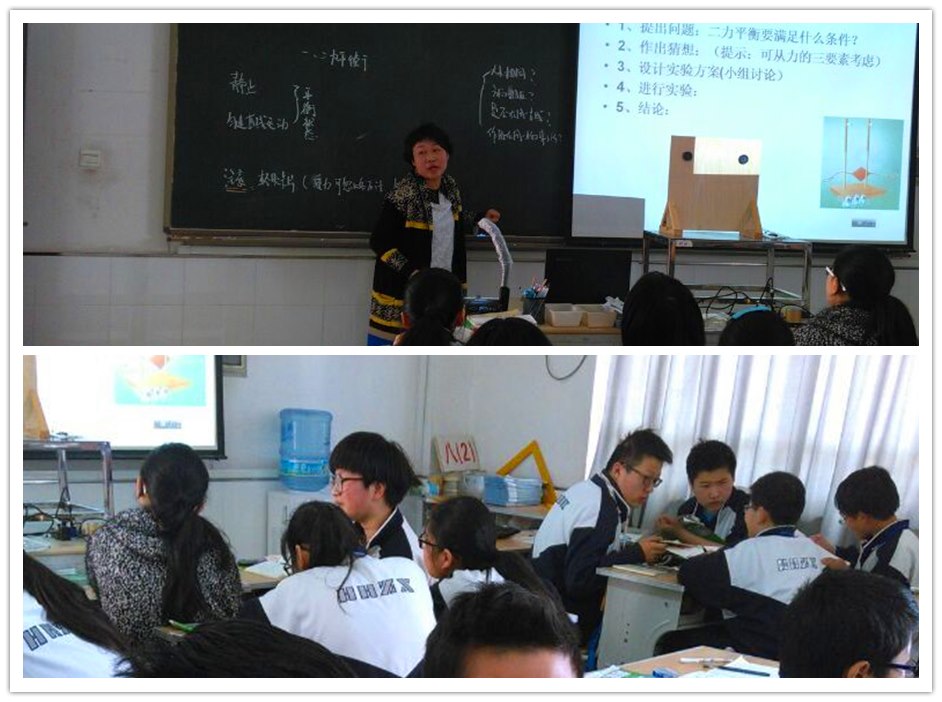 本次活动从上午第二节课开始,首先由培育室成员毛叶老师和金洁老师各上了一节展示课,课题均是《二力平衡》。虽是同一课题,但是她们展现了不同风格。毛老师上课教态亲切自然,富有感染力。她别具匠心的教学设计、多样的教学方法以及充满机智的课堂驾驭艺术,体现了物理创新课堂的教育性、科学性和趣味性的统一。课堂上她引用了大量源于生活的物理资源,从生活现象中挖掘物理知识,这正体现了从生活走向物理,从物理走向社会的新课程理念。金洁老师虽然是借班上课,但是她凭借自己扎实的专业基础、良好的教学素养,与学生的交流显得特别融洽。课堂上学生乐于与她互动,师生十分和谐。尤其突出的是金老师在本节课收尾时,引导学生用本节课所学习的二力平衡条件去完善之前所画的物体的受力示意图,体现了她的精心设计。