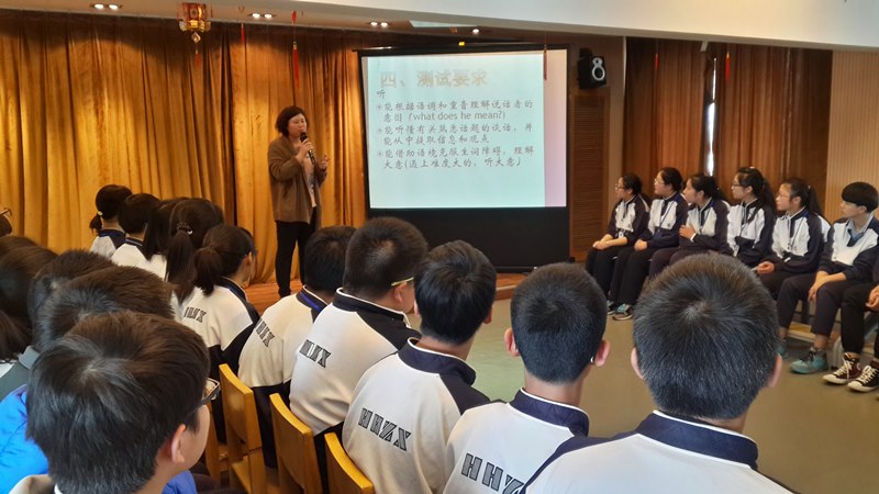 2015年中考第一仗,英语人机对话考试已迫在眉睫。为迎接这场满载机遇和挑战的战役,04月21日中午,我校英语教研组长高萍老师作了考前指导。
