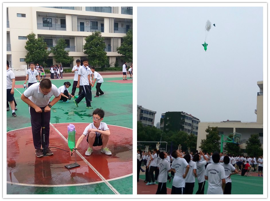 “嗖嗖……”一个个“水火箭”如出水蛟龙冲向天空。八年级各班的选手们不甘示弱,激情满满,一轮一轮角逐着最好的成绩。汗水浸湿衣服也不顾,降落伞打开失败亦不怕,他们不断改进,不断创新,不断尝试。看着一个个火箭搭载着选手们的希望冲向天空,划出一道道优美的弧线,最后顺利落地,一场场完美的视觉盛宴也让在场的观众们大饱眼福。八(6)班制作的“水火箭”以八秒多的飞行时间取得了最终的胜利。他们的团结与拼搏让我们感动。