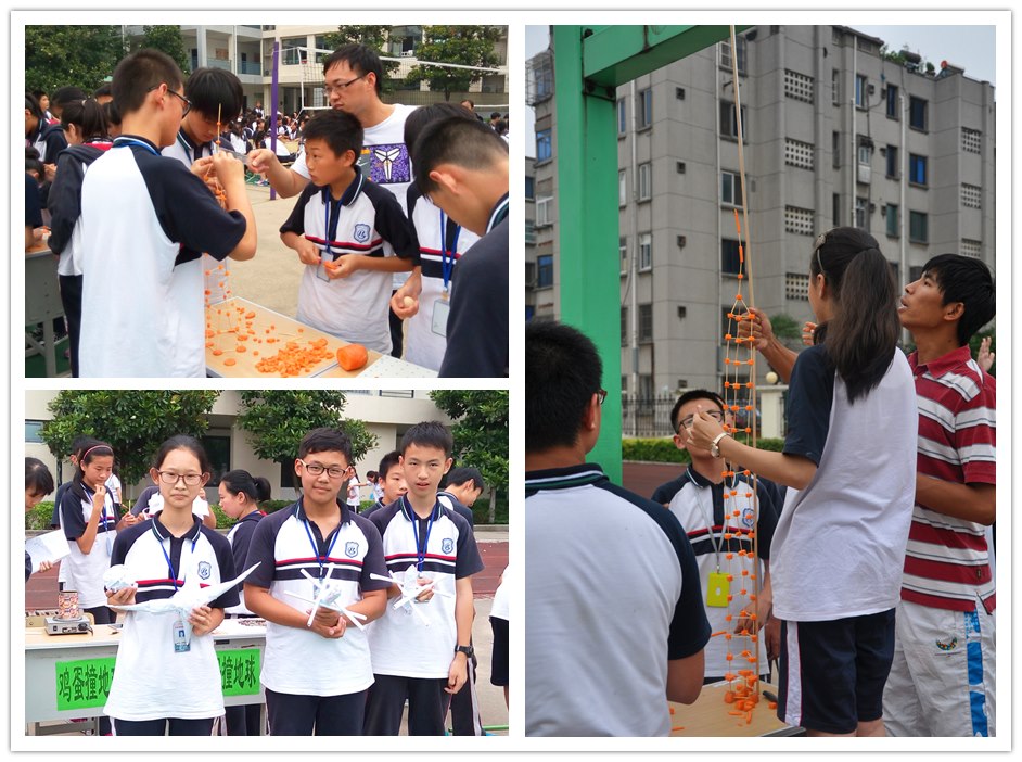 轻轻一碰就碎的鸡蛋,如何被抛远且完好无损呢?能不能改变“以卵击石”的噩运呢?在“鸡蛋撞地球”的创意大赛中,为了保证鸡蛋不碎,七年级的同学们正发挥自己的聪明才智,用几张纸和胶带给鸡蛋制作了一个个新颖独特的保护装置。“嗨,我成功了!”“哈,我的没破!”七(3)班的装置虽简单但扔得最远还依旧保持完好,乐坏了参赛的同学。“鸡蛋撞地球”,作为科技节的重头戏,撞出了无穷的乐趣,撞出了智慧的火花,撞出了创新思维的大门!
