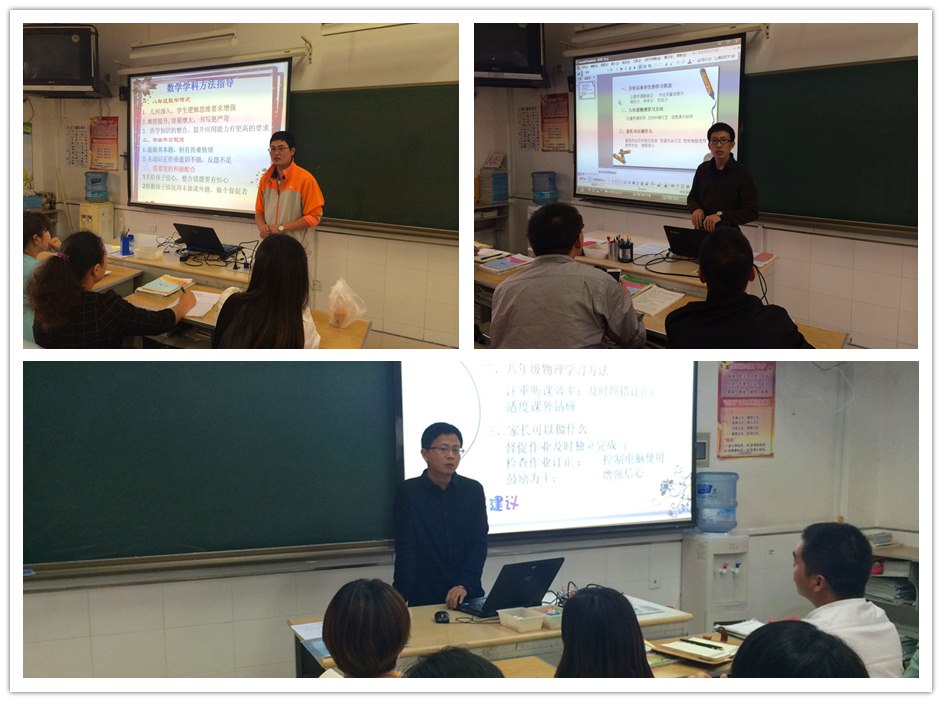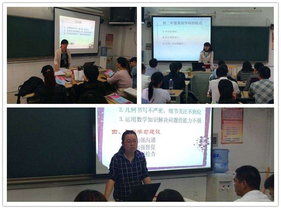 数理英精分析,立足常规抓实效。八年级数学、英语、物理备课组提前思考,在简短的时间内,与家长们倾心交流。数学老师从学科特点、学生学习现状和家长的积极配合三方面着手,力求实效;英语老师从“学生做”和“家长做”两大板块向家长阐述学好英语、提高成绩的有效途径;物理老师更多地在学习状态和学习方法上指引家长该如何帮助孩子养成好习惯和增强自信。三门学科老师的讲话言简意赅,层次分明,家长们认真倾听并做好笔记。