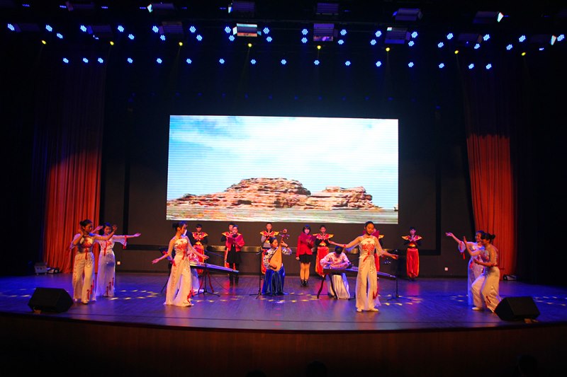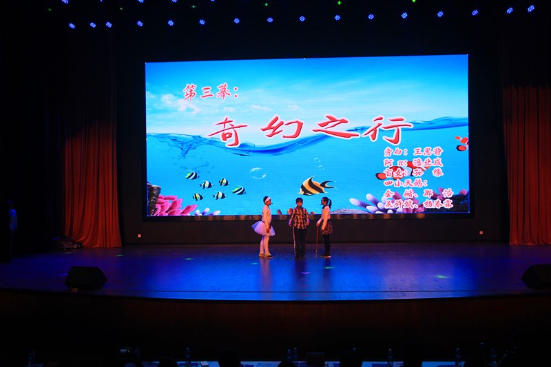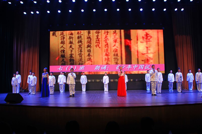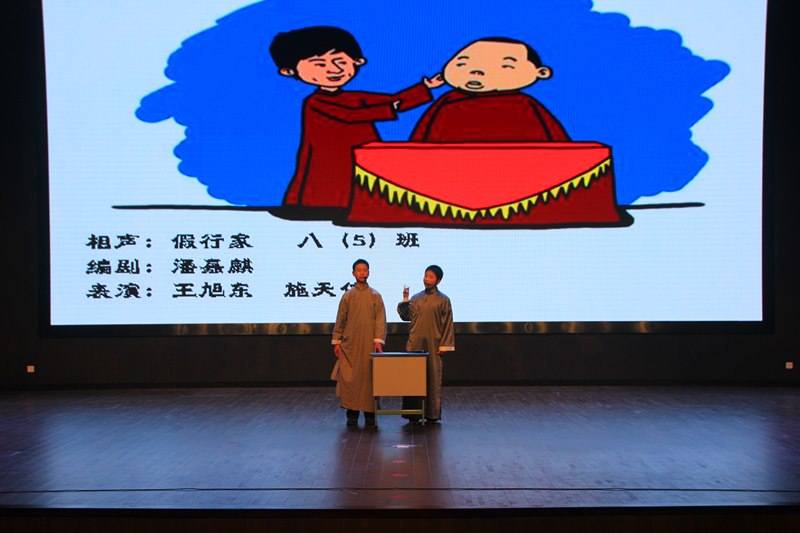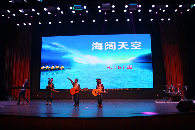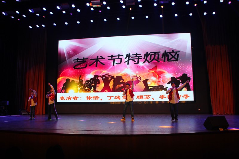 精心演绎,闪耀活力。接着,各班使出浑身解数,你方唱罢我登场。七(4)班的舞台剧《艺术节特烦恼》别出心裁,男生女生打擂台,耳熟能详的歌曲,欢快动人的舞蹈,还真有种“我要上春晚”的感觉。七(5)班的学生们更是给观众带来了一场音乐风暴,乐队演奏的《海阔天空》顿时嗨翻全场,青春年少、澎湃热血展现地淋漓尽致,让会场瞬间变成了欢呼的海洋,那种不屈不挠、渴望释放、渴望自由的精神更让所有人斗志昂扬。七(1)班的奇思妙想令人惊叹,他们带来的是情景剧《少年π的奇幻之行》,贴近生活,说的好像就是我们身边的你我他,是啊,在成长的过程中我们难免会遇到一些烦恼,只要我们充满信心,面向阳光,生命之花定会绚烂绽放。“少年智则国智,少年强则国强”,七(2)班的《新少年中国说》顿时吸引了人们的眼球:那铿锵有力的声音、那抑扬顿挫的语调、那整齐划一的动作,点燃了我们的热血青春。八(5)班的相声《假行家》以诙谐幽默的语言笑动全场,再次展现了两位相声新星的精湛才艺。接下来是七年级学生带来的助演节目——拉丁舞《炫舞飞扬》,学生们身着别致的服饰将得体、浪漫、休闲和随意完美呈现;优美的音乐,时而煽情、时而热烈、时而活泼,似乎只要置身于此,就能忘却学习中的烦恼,偷得半日闲来全身心地投入到艺术的殿堂中;拉丁舞者那动静结合的造型和丰富多彩的表现方式时刻透露着蓬勃活力,展现属于青春的所有美好。七(6)班同学的歌曲联唱更是把全场推向高潮,吴迪科、钱程、丁璐三位老师的倾情加盟让同学们激动不已,在这里,我们看到了希望、梦想、感动和成长,挑动着每一位学生的心神。八(4)班和八(6)班联合出品的节目是音诗画《大漠敦煌》,它再现了莫高窟的文化内涵,朗诵、舞蹈、表演合而为一,给人带来一场视觉盛宴。八(1)班的学生带来的则是街舞《最炫民族风》,一群阳光帅气的舞者一出场瞬间引爆全场,优美的街舞动作此刻都是青春活力、阳光向上的化身。将近两个小时的汇演中,台上节目精彩纷呈,台下掌声、欢呼声此起彼伏,同学们用激情、奋进和活力演绎着属于自己的青春。