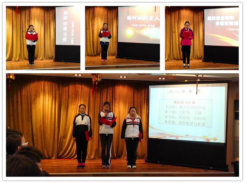 首先,各年级十佳代表为我们介绍了她们自己的良好学习方法。七(3)班许雯茜同学告诉我们学习的小秘诀在于精益求精,明确目标,端正学习态度。八(3)班程诗媛以自己的亲身经历告诫我们要做时间的主人,善于抓住课堂时间、碎片时间以及课余时间来提高学习的效率。九(1)班刘闻暕同学则希望大家立足课堂提高效率,合理安排复习时间,培养独立自主、静心学习的能力。