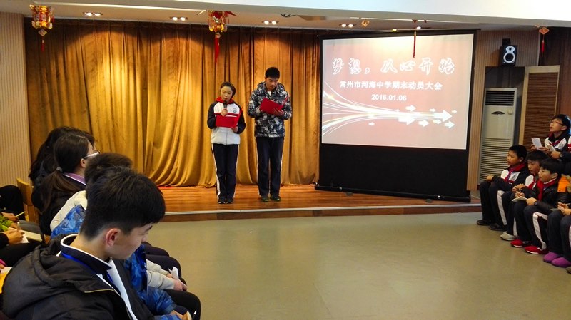 充满激情、充满活力的2015转瞬即逝,随着即将敲响的新年钟声,满怀希望、满怀机遇的2016向我们款款走来。为了让同学们树立自信、有效复习、实现梦想,常州市河海中学于01月06日召开了以“梦想,从心开始”为主题的期末动员大会。