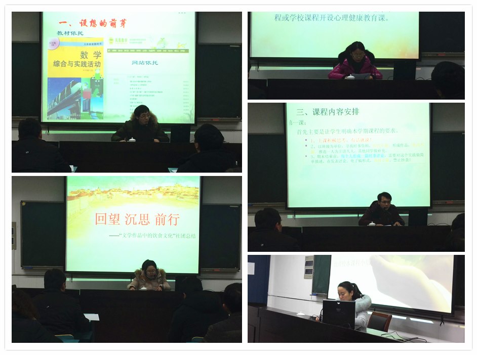 本次研讨会首先由河海中学本学期开设校本课程的5位教师代表作交流发言。唐新亚老师代表语文学科做了美食为主题的校本课程交流发言,阐述了课程开发的理念、背景、目标,展示了课程实施中丰富的活动,最后还提出了自己的反思总结及后续改进的措施。钱程老师从课程设想的萌芽、方案的形成、活动的开展、活动的困惑等方面全面汇报了开设数学校本课程中的思路、成效及收获。潘甦娜老师用乐于探索、寓学于乐、乐于反思为关键词回顾了一学期来地理校本课程的实施过程,罗列了同学们丰富的体验及丰硕的成果,并提出了要运用团队的智慧,努力开发出学生们喜爱的校本课程。吴杰亮老师从“风声、雨声、读书声声声入耳;国事、家事、天下事事事关心”入手,汇报了“时事咱谈”校本课程的背景、目标、内容等方面的情况,总结了一学期以来课程开设的亮点与不足。最后李燕老师就开设心理校本课程作了汇报,从课程的设想、实施、反思等方面全面总结了活动的过程、成果及意义,丰富多彩的活动、积极有效的措施,让在座老师叹为观止,深受启发!