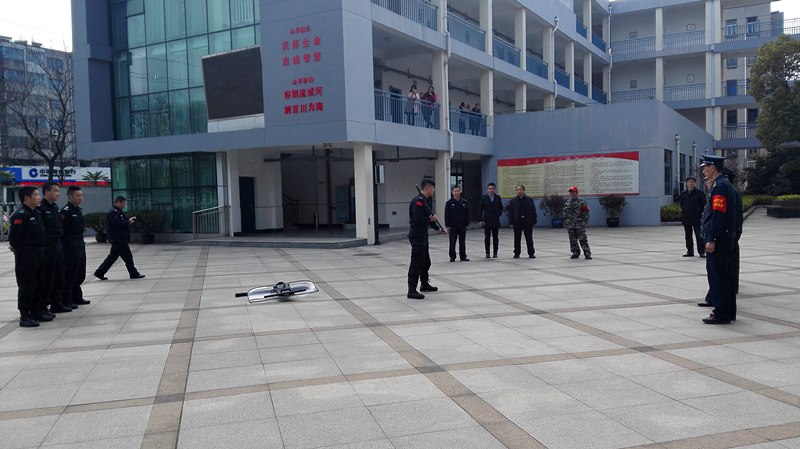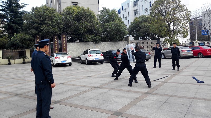 培训中,民警向学校四名保安讲解爆炸物引爆、歹徒行凶等专业知识,分享应对恐怖袭击事件的办法和技巧。随后他逐一演示了警棍、钢叉、盾牌等警用装备的使用方法,并现场请其他警员实战展示“制服歹徒”的几个重要动作。飒爽的英姿和精彩的演示,也立刻吸引了课间休息的学生和老师前来观看学习。演示后,学校保安按照民警的指导准确地使用警用装备,并相互进行演练反恐防暴的动作。本次培训学校周边兰翔社区的安保负责人也一同进行了学习。