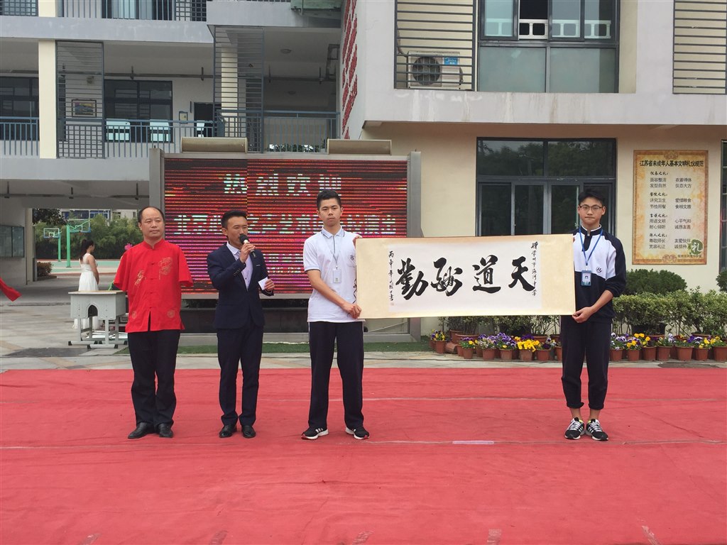 最震撼人心的是,失去双臂的蒿天增以口代手,送上口书——“天道酬勤”,现场还将书法作品赠送给了学校,他用这四个字勉励全体师生,自信自强,不断攀岩,用双手书写更辉煌的明天。