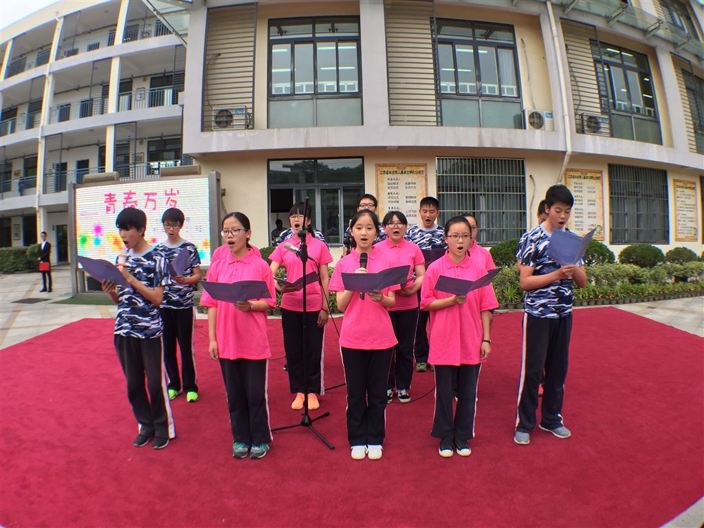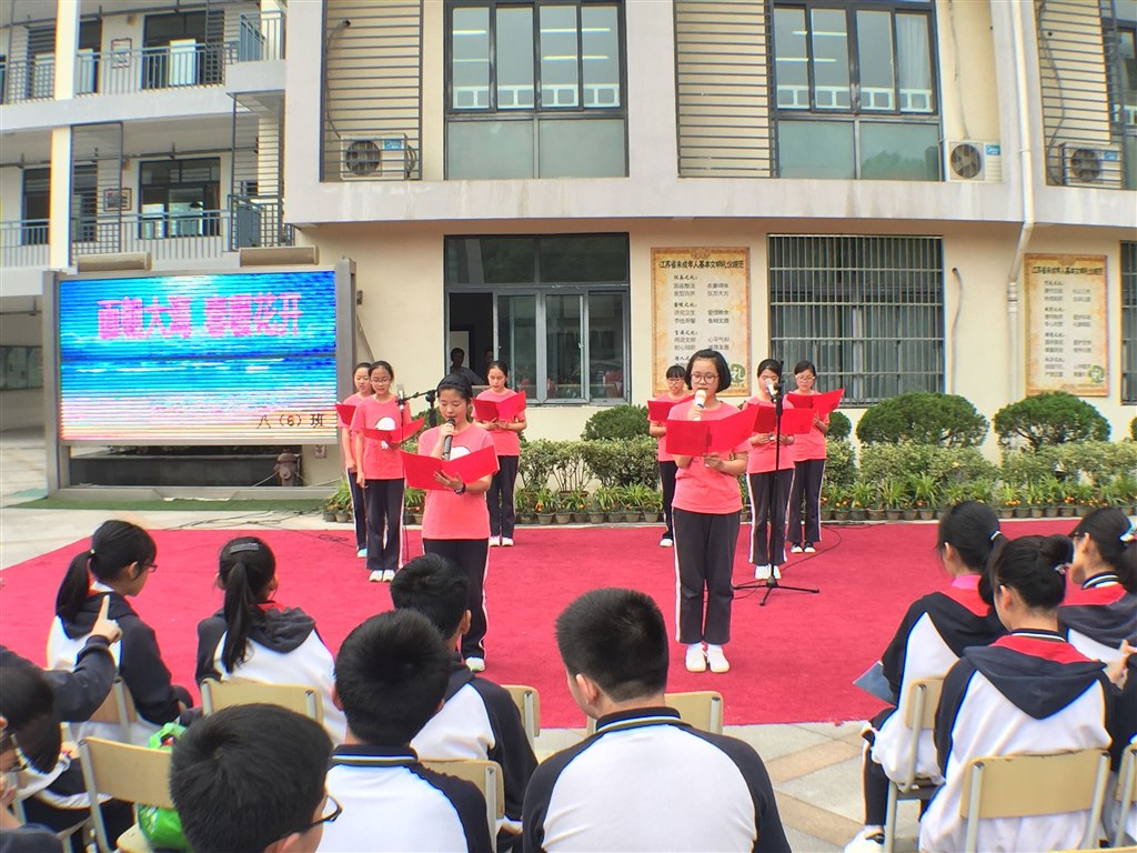 打头阵的是八(5)班带来的诗朗诵是《青春的渴望》。只见他们穿着整齐的校服,昂首阔步地踏上了舞台;只听他们那铿锵有力、清晰洪亮的声音在校园上空回荡。在他们的诗歌中,我们领悟到,行走在青春的路上,欣赏着青春的风景,更应懂得“青春的渴望”。未来的自信,离不开青春的奋斗,八(4)班带来的《相信未来》,让我们在慷慨激昂中收获了自信,收获了对未来的憧憬,对未来的渴望,对心中信念的固守,对美好明天的向往。