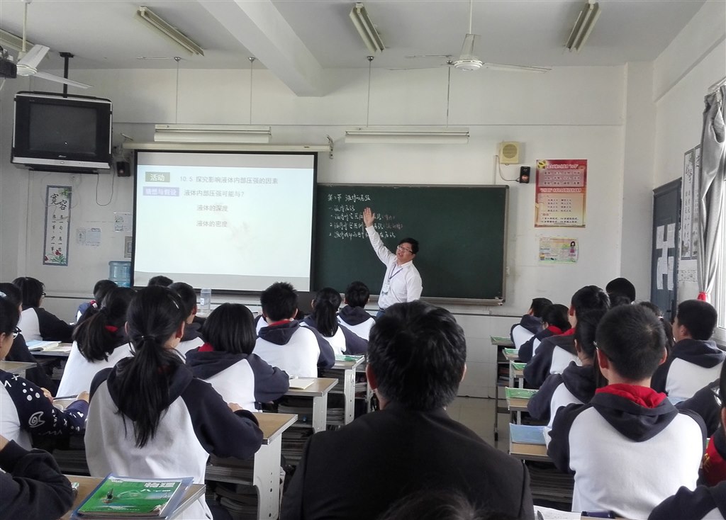 校长示范引领。此次研讨课由王强副校长以《液体的压强》一课首开引领,本节课充分体现了学生主体、教师主导的教学理念,处处闪亮着“智慧课堂”的特质。如教师自制教具演示实验,形象直观,方便操作;学生的小组合作交流,生动活泼,积极主动;教学内容的预设与生成,主线清楚,环环相扣;教师的课堂动作和语言,幽默风趣,宽松亲和;教材前后知识点的联系,温故知新,拓展延伸;学生科学精神的培养,实事求是,尊重实际。教师通过自己丰富的学科知识、高水平的课堂驾驭能力、得体的举止、富有感染力的语言、饱满的情绪,使每一位同学都以积极的状态投入到学习中去,都认真地听讲,积极地探究,全身心的投入,整节课下来,学生注意力集中,思维灵活,态度端正,展示到位。为本次河海中学“智慧课堂”公开课的启动开了一节极具示范作用的好课,让在座听课的青年教师感觉受益匪浅,赞叹不已。
