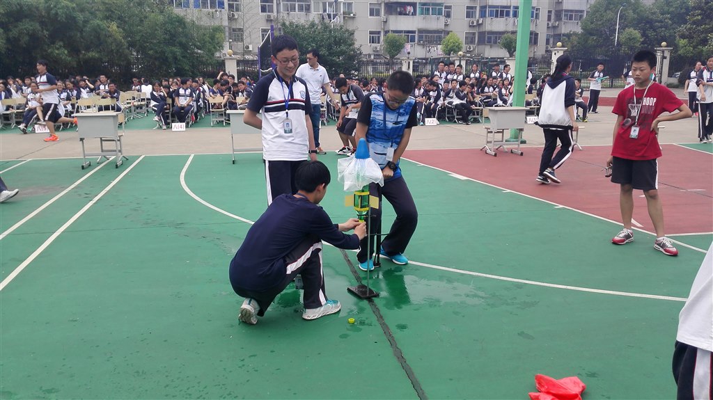 在操场的正中央,一个个选手拿着用废旧饮料瓶制作而成,形状、大小、颜色不拘一格,各有各的独特英姿的“水火箭”。同学们的创造能力和动手能力在此得到了充分的展现。不一会儿,水火箭一个接一个飞上了天,有的飞得很高,有的却只是飞了几米便掉了下来。大家的神情也各不相同,有的低头失望,但并不气馁,有的兴奋地欢呼雀跃,但并不骄傲。选手们竭尽全力地打气,水火箭则在观众们的惊呼声中腾飞,留下一道道喷射而出的水的轨迹。可以清楚地看到,火箭飞出的那一刹那,每个选手的脸上都写满了难以抑制的激动与期待,更掺杂着一份紧张,他们额头的汗水清晰可见,目光紧紧地盯着升空的水火箭,仿佛在给予它力量,只希望它飞得久一点,再久一点。