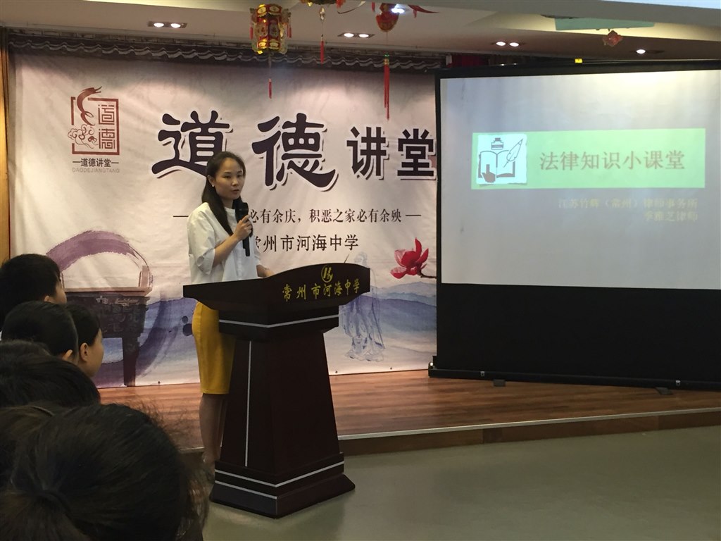 成长万里路,法制在心间。学校为了让学生学法懂法,更全面地普及法律常识,诚意邀请江苏竹辉律师事务所的季雯晶律师来校作讲座。季律师很是和蔼可亲,开场和同学们热情地打招呼。在讲座的过程中,以法律文件为导引,以社会真实案例为佐证,真诚地期望同学们把法制观念植入人心,在假期中要遵纪守法,要做一个知法守法的好公民。期间,季律师与会场的同学们还交流互动,让法制专题讲座有声有色,赢得了阵阵掌声。