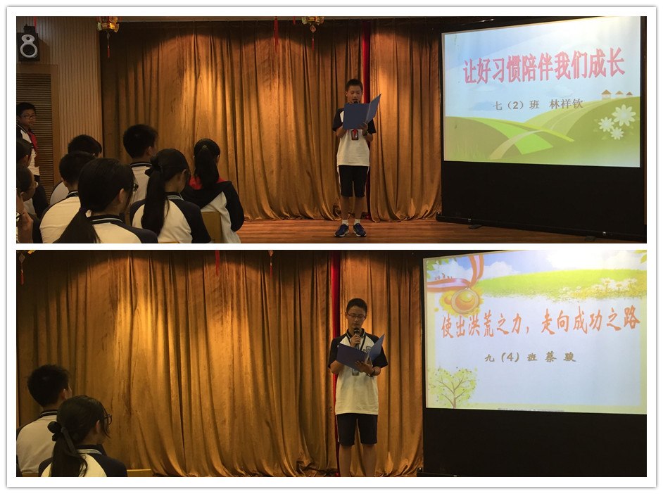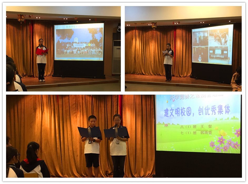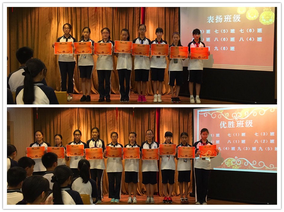 新学期新气象,各班在班级文化建设上下功夫,创新貌,扬个性,营造了良好的学习氛围,综合组马郁茜老师为各年级的班级文化建设做出点评并提出了希望。在常规管理方面,值周生代表七(1)班韩雨奇与八(1)班王王粲就开学两周检查的情况,肯定了开学以来同学们在常规上取得的进步,并提出了改进之处。学生代表七(2)班林相钦、九(4)班蔡骏也向大家讲述了自己的学习心得,从他们的讲话中,我们懂得了学习须有冲劲。在开学阶段,各班都能及时总结,迅速进入状态,取得了很好的成效,都在为争创“优胜班级”而努力奋斗,各班学生的一言一行都在为班级加分。根据开学以来各班的表现,综合各方意见,学校评出了开学竞赛优胜班级和表扬班级,教导处戴亚萍主任为获奖班级颁奖。
