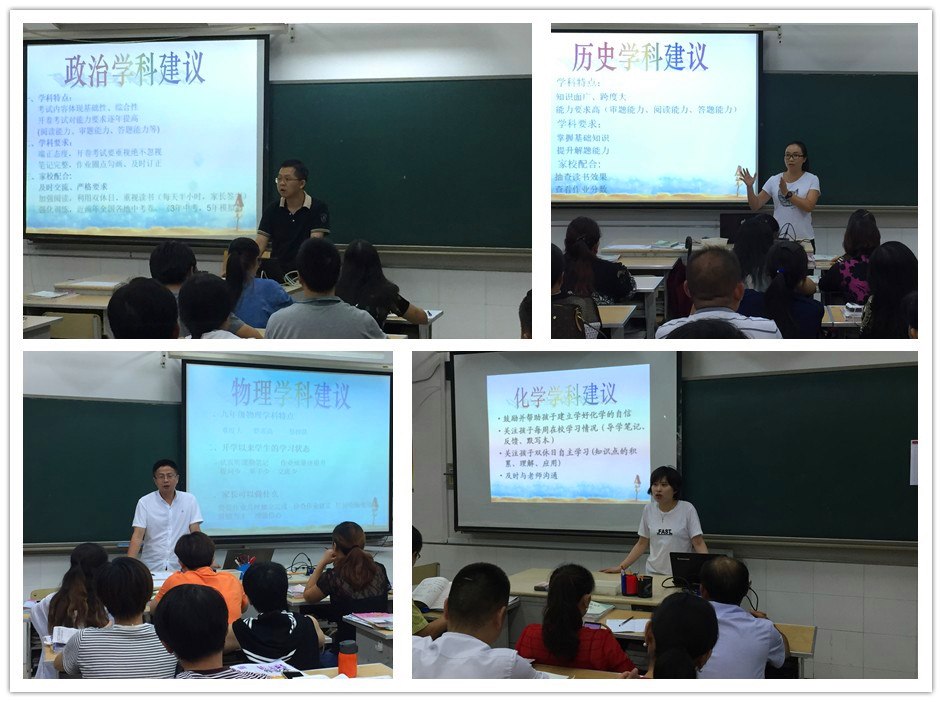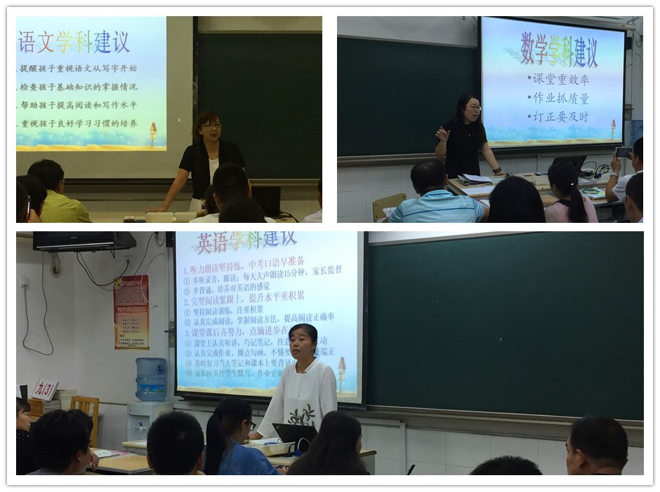 三、班级分析,寻求共赢。班主任结合班级情况,具体问题具体分析。提出九年级是学习态度决定一切,充满竞争充满变数,以开学初学生表现为典型,真情解读,引导家长明确:帮助孩子学习,责无旁贷。并给予四点建议:多一点示范,帮助孩子养成良好习惯;多一点检查,督促孩子提高学习效率;多一点关注,引导孩子学会自主学习;多一点沟通,关心孩子身心健康成长。