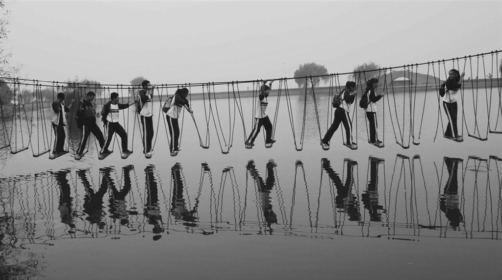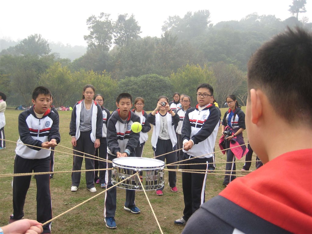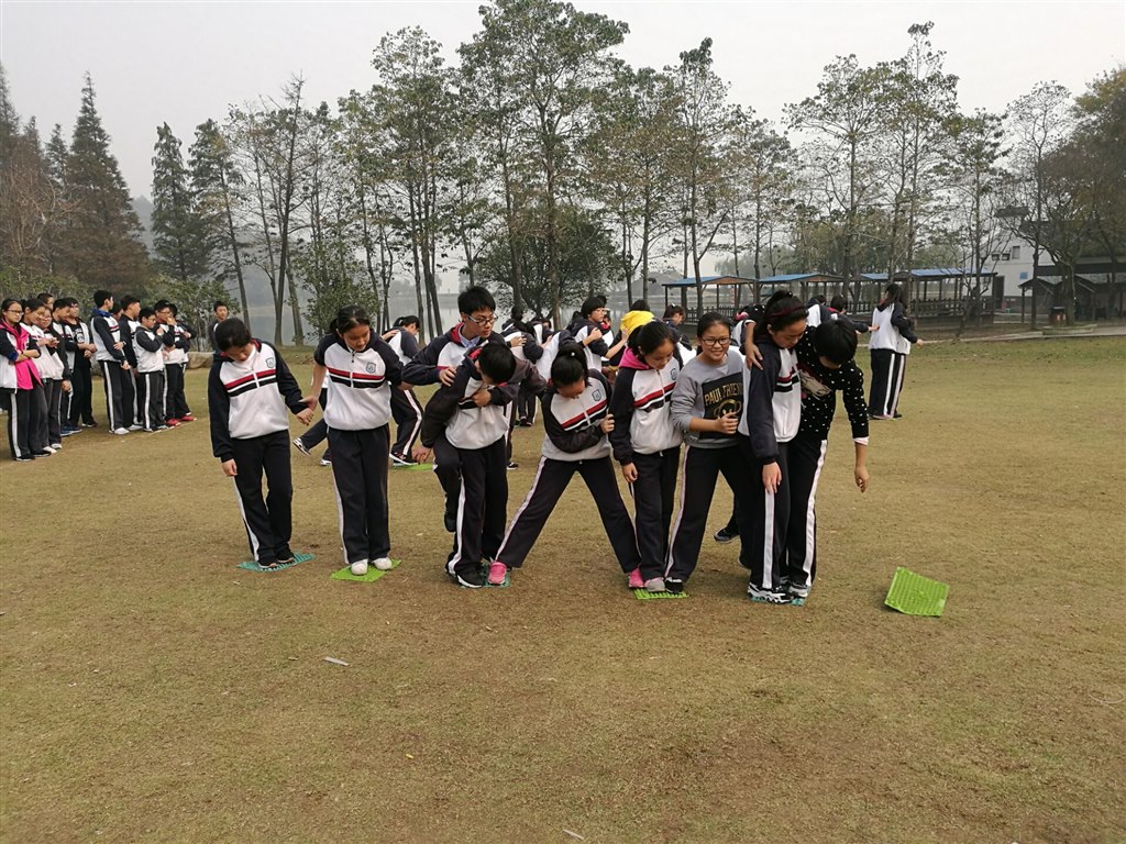 而令我们无法自拔的,除了这如诗如画的风光,还有那趣味十足的拓展活动。在教官的带领下,我们行至一片宽阔的草地,教官简述了“横渡硫酸河”时的规则,要求小组成员用仅有的6块踏板行至20米远的对岸,成员们积极思考应对措施,在全员安全渡河的情况下提高效率。只听一声令下,所有领头人员飞一般踏着踏板冲向前方,后方队员紧接而至,踏板上的同学紧紧相拥,依靠彼此的肩膀艰难地站立着,压轴队员开始传递踏板,“快!快!快!”这样急切的号子响彻草地,气氛在欢乐与紧张中不断交替。这时,站在踏板上的成员,肩负的不仅是一个人的成败,而是一个团队的安危,因此,渡河的难点不在于河的长度,而在于每个人心理上的承受能力,如何做到快而不乱,稳而不慌,这都是在考验着整个团队之间的默契与每个成员心理的调控能力。