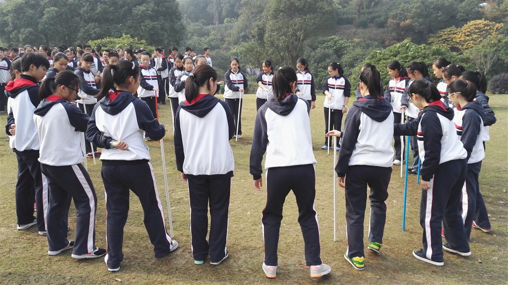 在教练幽默风趣的话语的指导下,我们展开了又一项团体项目——“圆心接棒”。教练指导我们以两位同学为圆心、以不同的时针方向转圈,在换位的同时接住身旁另一位同学手中的管子,时间最短为获胜。刚听完教练的要求,同学们竟一阵兴奋,因为——这个游戏也太简单了!当哨声响起时,同学们却开始手忙脚乱起来:有些同学左右难辨,时常撞到身边的伙伴;有的同学反应略迟缓,一根根色彩鲜艳的管子应声落地;还有的同学因为紧张,发挥也频频失误——原来这并没有想象中的那么简单。经过一刻钟的练习后,同学们个个都熟能生巧起来,虽然小错不断,但同学们的心却在不知不觉中靠拢,我们也在不知不觉中渐渐成长,学会处世之道。