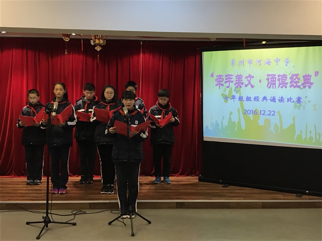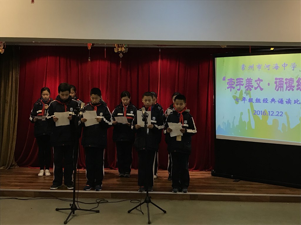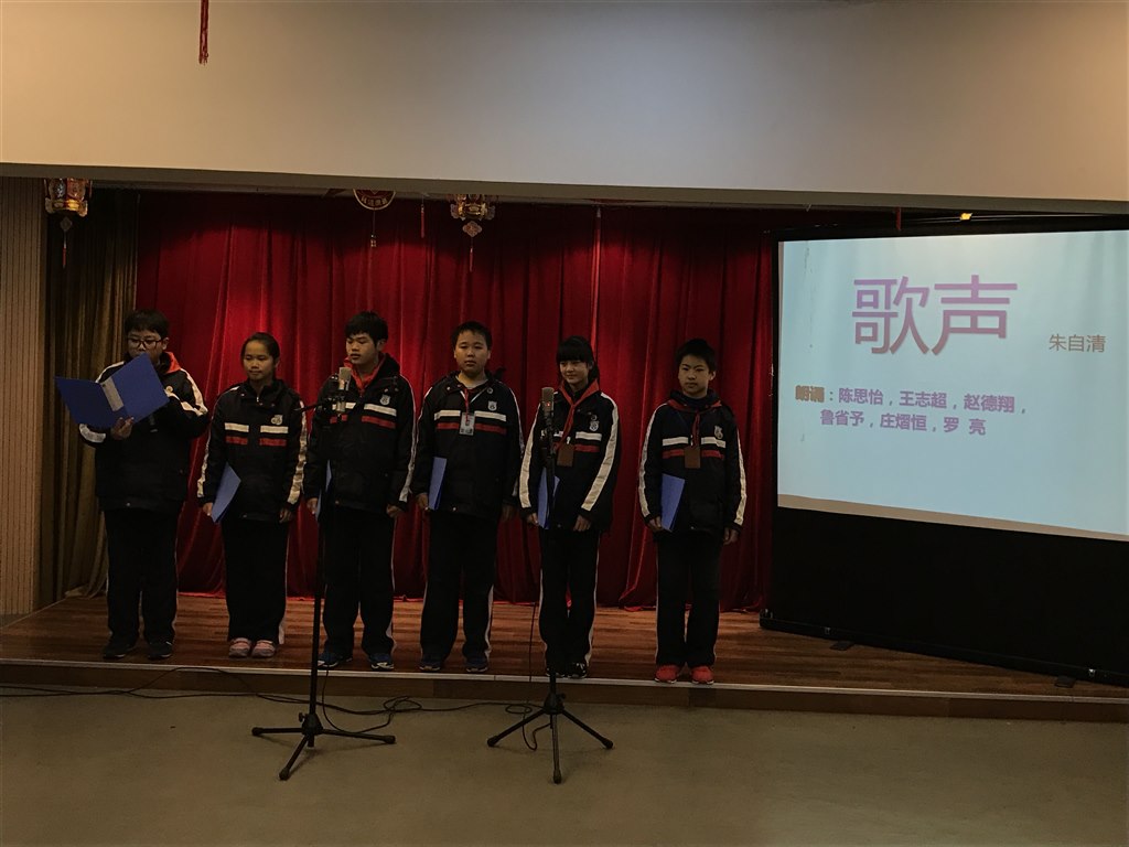 比赛中,同学们精神饱满,情感随着诵读经典尽情萌发,个性随着传承文明尽情张扬。首先上场的是七(2)班,他们为我们带来了精彩的《歌声》。朗朗的诵读声配上悠扬的音乐,大自然的声音在耳畔轻轻回荡,短短几分钟便让我们聆听了万物的歌声。紧随而上的是七(3)班,他们朗诵的《美是什么》可谓是穿透心灵。淡淡的二胡声映着清脆飘扬的诵读之声,让人仿佛置身于无尽的幸福之中,并且回想起生活中幸福的点点滴滴。而这一切都源于儿时的梦想,七(1)班的《献给遇罗克》,则通过一句句富有哲理的语句,告诉我们应不忘初心,坚守儿时的梦想。儿时的梦想怎可能轻易成功?七(4)班带来的诗朗诵《坚持不懈,直到成功》生动诠释了这个道理,他们用铿锵有力的声音告诉我们失败不是终点,坚持不懈总会成功。当我们沉醉于美好时,七(5)班带来了一首《中国少年说》,抑扬顿挫的朗读唤起了我们少年之责任。七(6)班朗诵的《美》,节奏舒缓,娓娓道来,让我们沉浸其中,不禁感受到美就在我们身边。
