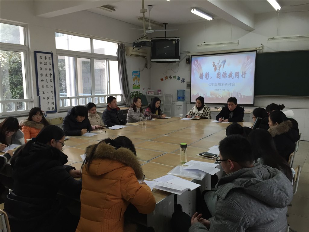 七年级年级分析会由办公室赵军主任主持,全体任课老师畅谈一学期来的心得体会,气氛融洽,收益颇丰。