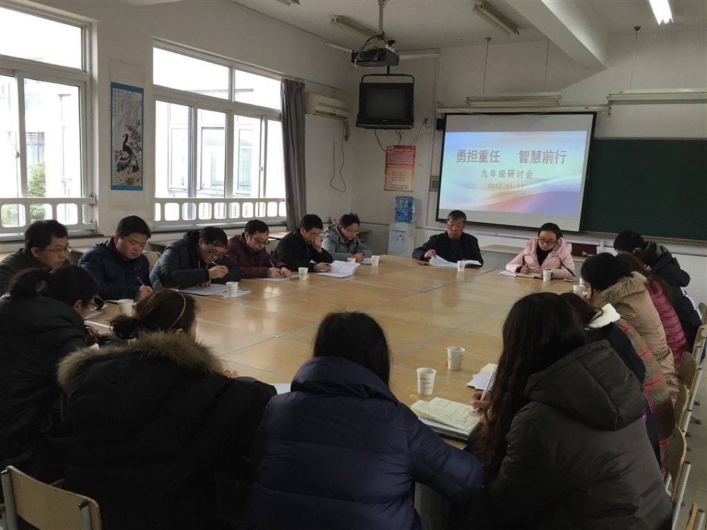 2017年01月17日,常州市河海中学九年级全体老师对一学期来教育教学情况进行研讨,研讨会由教导处副主任朱虹主持。