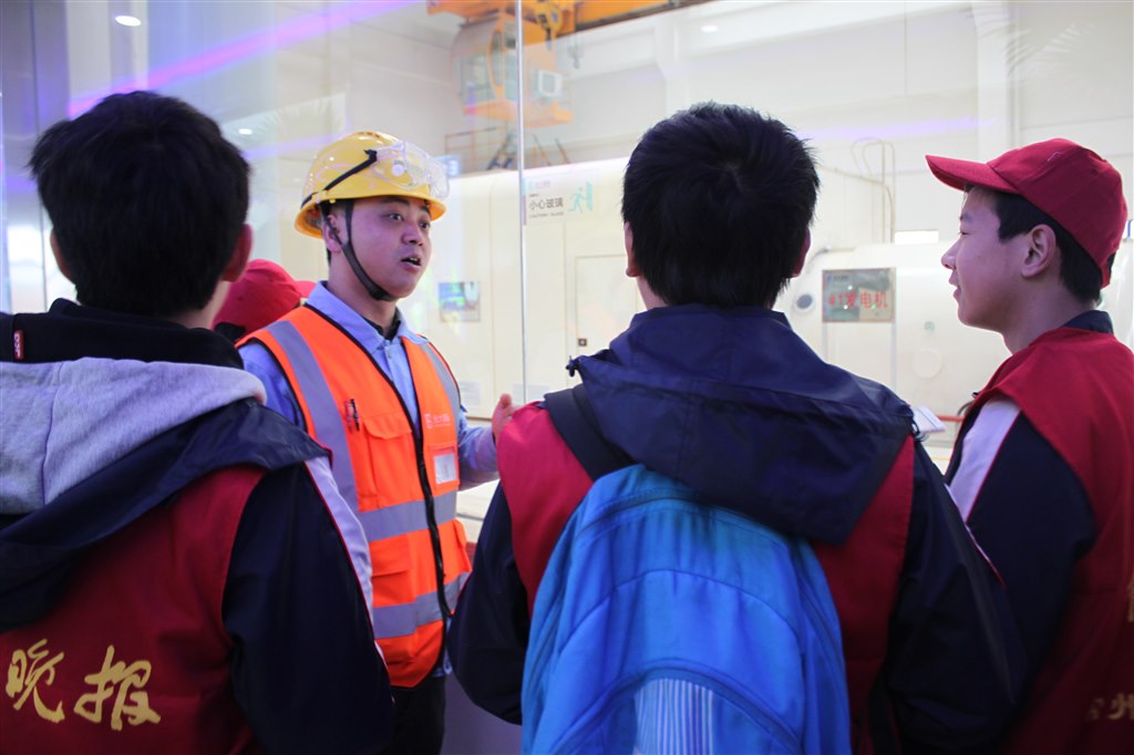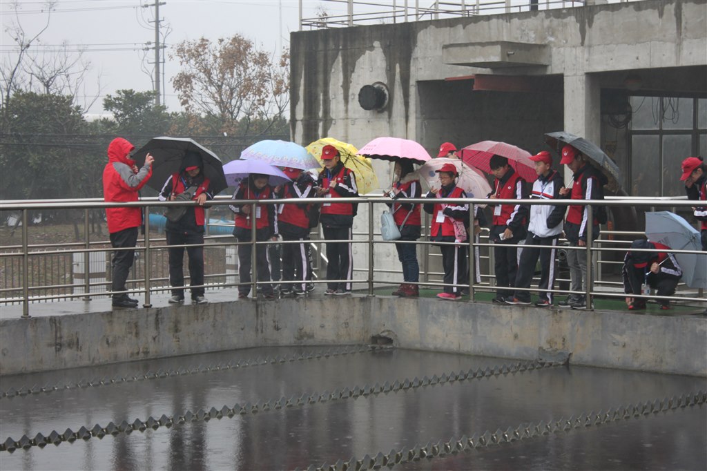 第一站,江边污水处理厂。观看流程展示板,通过讲解员的讲解,我们了解到:污水需要经过七、八道工序才能够净化成达标的水,排放到长江。接着,我们爬上一座高高的平台,只见硕大的水池中,奔腾翻滚的浊水在池子里冒着泡,还散发着氤氲热气。“这些水是热的吗?”细心的同学注意到了微微升腾的气体,立刻提问。讲解员叔叔告诉我们,这些水大约在20℃左右。处理厂会根据进水的各种情况,来决定水温。随后,我们又参观了污泥、污气的处理现场。拐了几个弯后,我们来到了中控室。中控室空间不大,但是却布置了许多高科技的仪器。一块屏幕占据了大部分的墙面。上面投影着整个厂的俯视图,由蓝色,绿色,粉色的不停流动的虚线串联而成。“我们的污水大概就是以这个路线流动的。”我看到,每一个流程都相互配合,有条不紊地进行着,相得益彰。我想,只有这种默契的配合,倾心倾力的付出,才能更好的保护环境、造福人类吧。