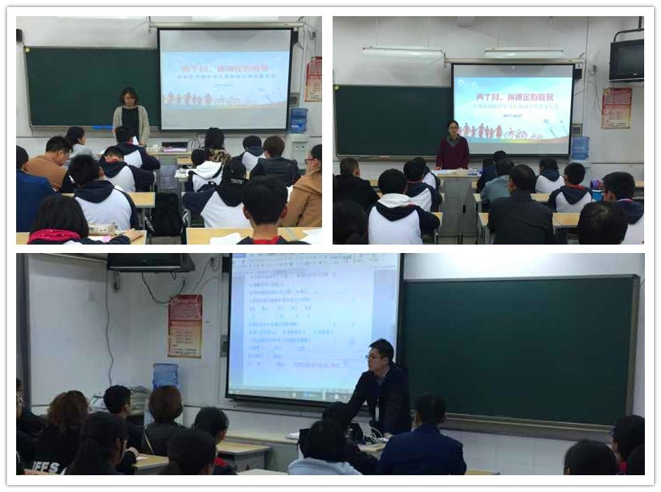 会上,班主任首先根据之前学生调查问卷得出的数据,科学分析了与会学生学习成绩进步或退步的原因,并以学生向往的高中目标和学习中存在的问题,详细地向家长们反馈了学生在校学习的实际情况,强调作为毕业班的学生,应该做到:静心上好每一堂课;用好午自习和晚自习,保证每天作业独立且全部完成,及时订正作业和默写;每天花一定时间背口语、练听力,用好体育课和大课间锻炼身体,打好中考前两战;每周有计划地进行复习,有时间去做拓展。家长们都认真倾听,及时记录。