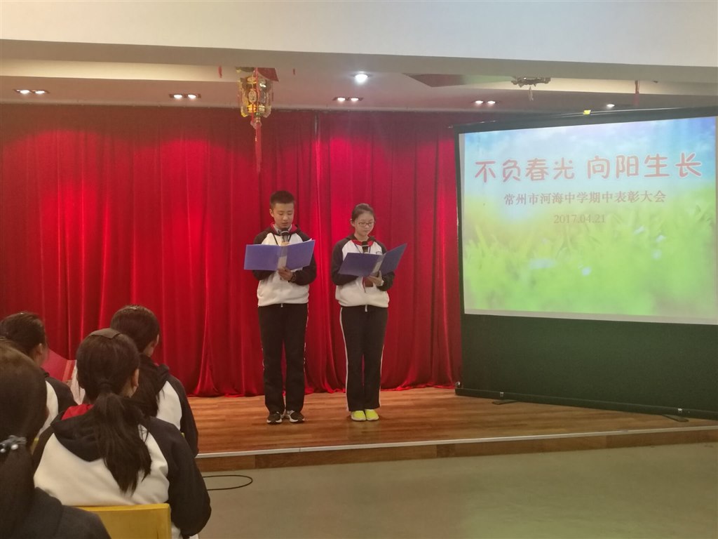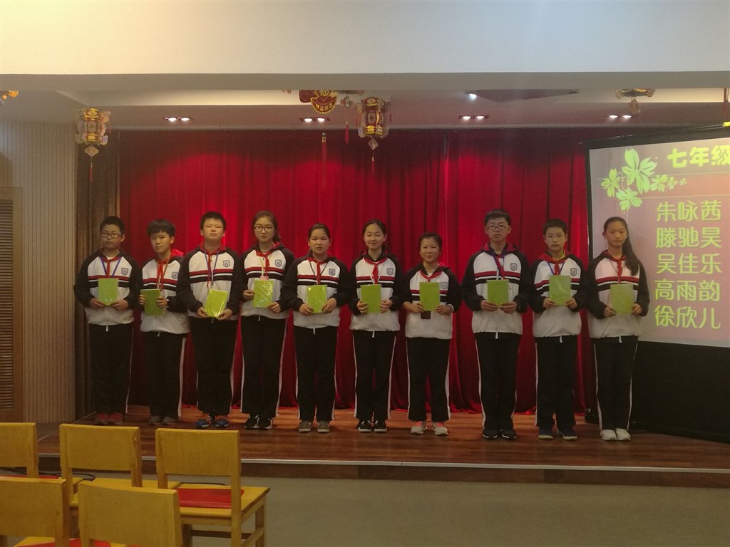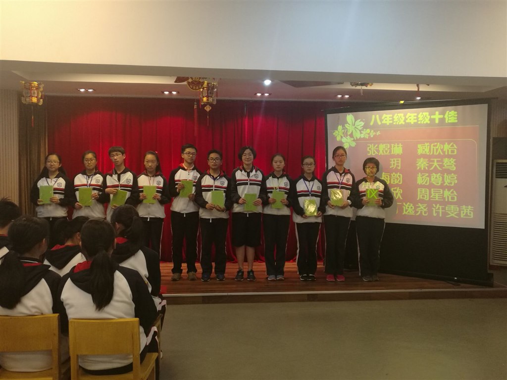 期中质量调研已顺利结束,在激烈的竞争中,部分同学脱颖而出,荣幸成为年级十佳。八年级年级十佳的诗朗诵表演,铿锵有力,柔中带刚,字字句句诠释着青春的无限希望,也为期中表彰会拉开了序幕。半个学期以来,同学们凭借着自己的努力,采撷了甜美的果实。在各级各类的比赛中,部分同学取得了佳绩;还有一些同学为班级默默付出,得到了大家的认可,也收获了一份属于自己的精彩。学校为这些同学颁发了奖状,希望大家再接再厉,继续营造良好的学习氛围。七年级十佳带来的小合唱《我的未来不是梦》,振奋了在场的同学,唱出了我们的心声,再一次提醒我们抓住大好春光,迸发热情,未来即在不远处。