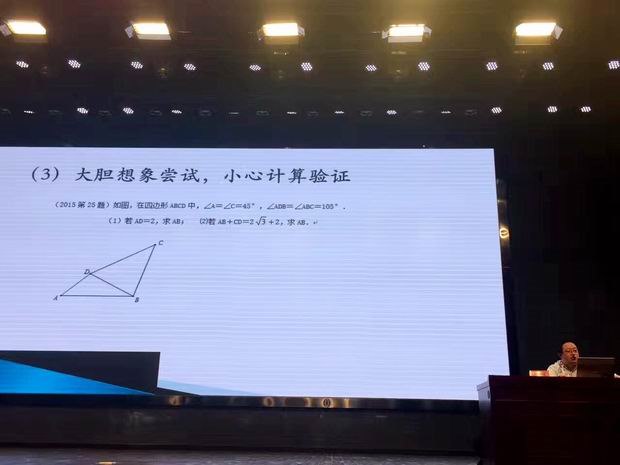常州市数学兼职教研员陈晓东老师首先分析了中考数学题型,呈现了难度系数。然后重点讲解了两种策略:一是尝试法,以2015、2016的年中考大题为例,在投影上展示了不断尝试探索的过程;二是发散性思维,仔细审题圈划关键,根据所给的信息进行大胆猜测。最后,陈老师还介绍了匈牙利数学家的四步解题法:审请题目,制定计划,实行计划,反思总结。
