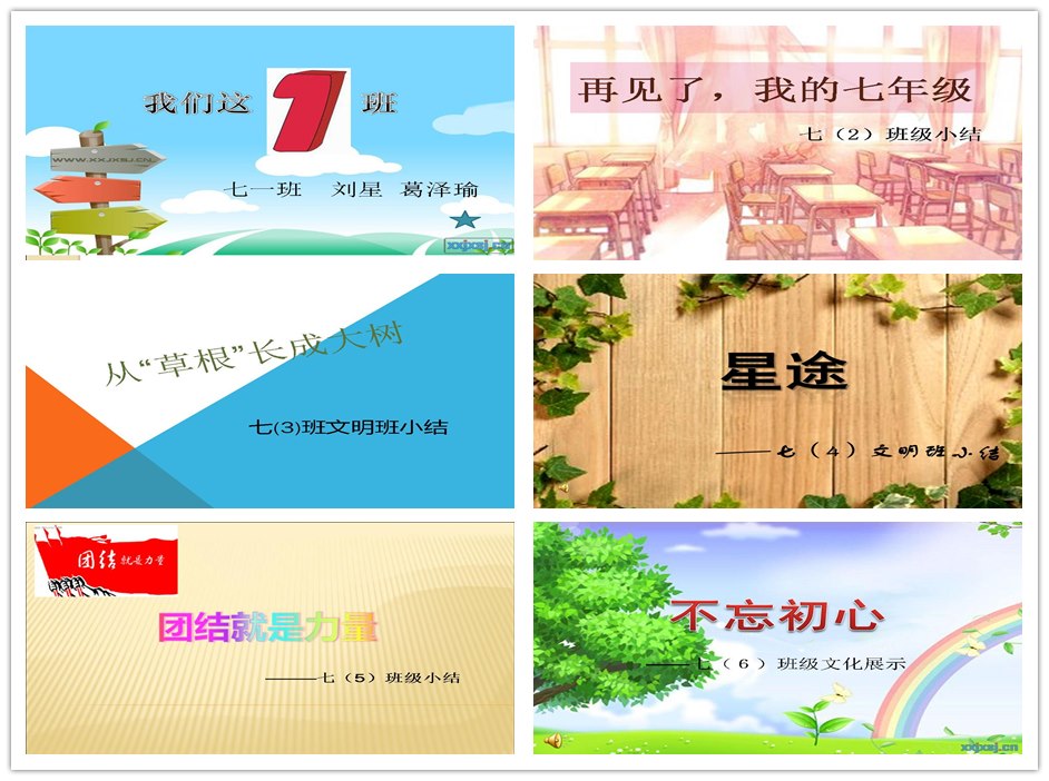 七年级的各个班都别具匠心,每一个代表都为我们讲述了一个又一个温馨的故事。七(1)班以“快乐一家”自居,这无不体现着一个集体的团结和睦,令人倍感羡慕;而七(2)班则是强调“Work hard every day”,这句话警示着同学们务必让每一天都过得充实而有意义,无不展现了班级欣欣向荣的前程;“从草根长成大树”,这是一项巨大的工程,同时也是七(3)班同学最大的梦想;我们总能看到人们成功的辉煌,可谁又知其背后的不易,这是七(4)班为我们娓娓道来“星途”背后的成长史;七(5)班的班级展示简洁明了又质朴大方,总结概括了同学们在一学期中的出色表现,体现了极高的班级凝聚力;七(6)班用几组关键词总结凝练了一个学期中的亮点与不足,不光让我们反思自我有没有忘却初衷,更让我们警醒,自己是否有双善于发现的眼睛。