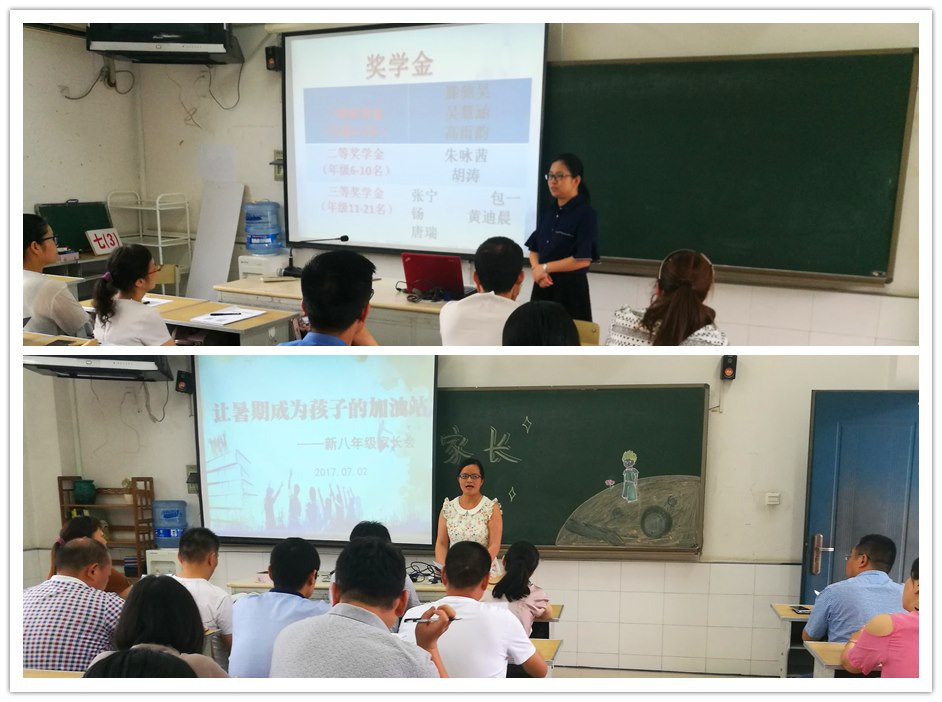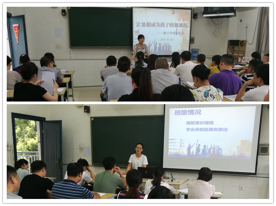 最后,各班班主任从期末考试班级概况、八年级面临的挑战以及暑期建议三个方面和家长做了简单的交流。