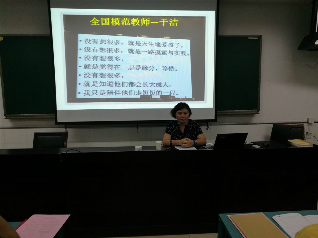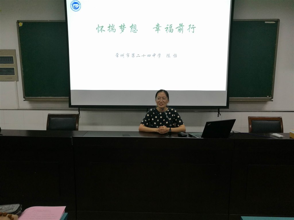 怀揣梦想,幸福前行 培训由常州市第二十四中学党总支副书记、副校长陈怡开讲。她与新教师共同分享:(一)教师为什么要有教育理想。教师要有民族振兴的时代担当;教师要有立教兴教的时代担当;教师要有传承经典的时代担当;教师要有塑造生命的时代担当。(二)你有怎样的教育理想构图。古之《论语·先进》描述的场景;发达国家英国夏山学校创造一个不是让孩子们来适应学校而是去适应孩子的学校的教育理念以及日本巴学园独特的教育环境和教育教学方式。(三)穿行于理想与现实之间。当前教师面临的挑战有:知识结构的变化、教育教学观念的更新、新型教学手段的运用、数字化时代带来的更为快节奏的工作方式;还有来自于学生方面的家庭环境、成长经历、个性与天资。(四)追寻教师的幸福生活。享受心态年轻的幸福、享受爱心付出的幸福、享受爱心回馈的幸福、享受共同成长的幸福……顺木之天,以致其性,道德养生涵养职业幸福,专业成长提升职业幸福。