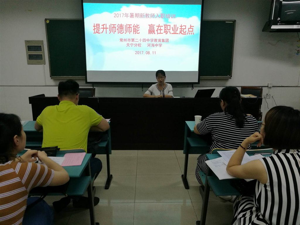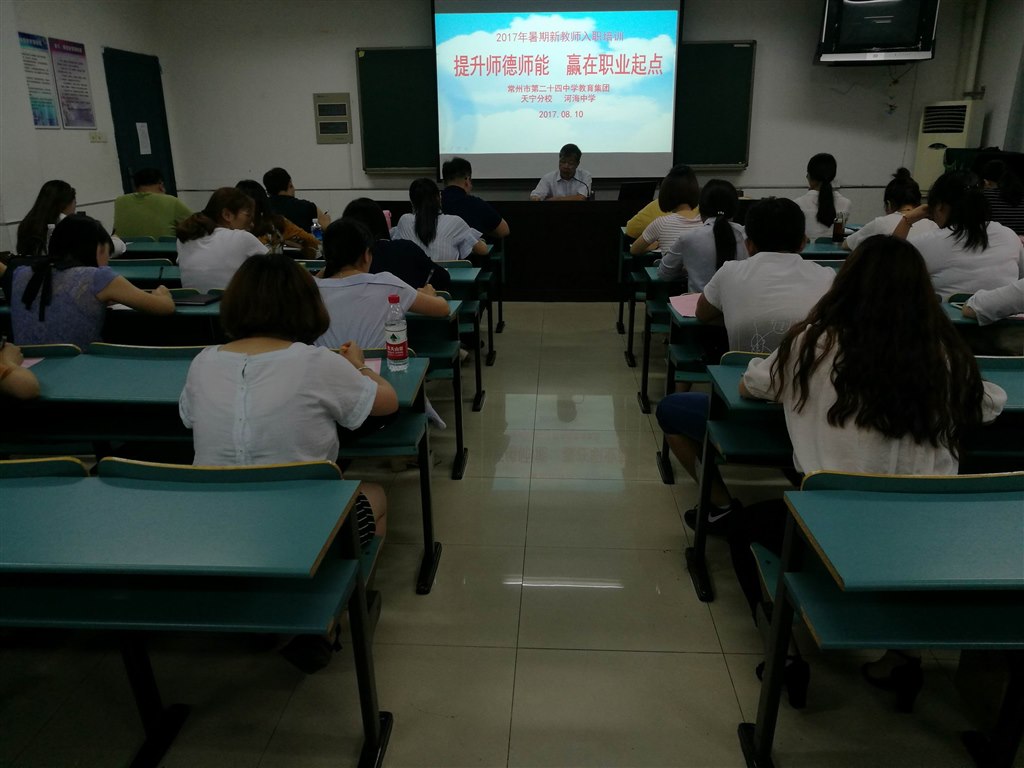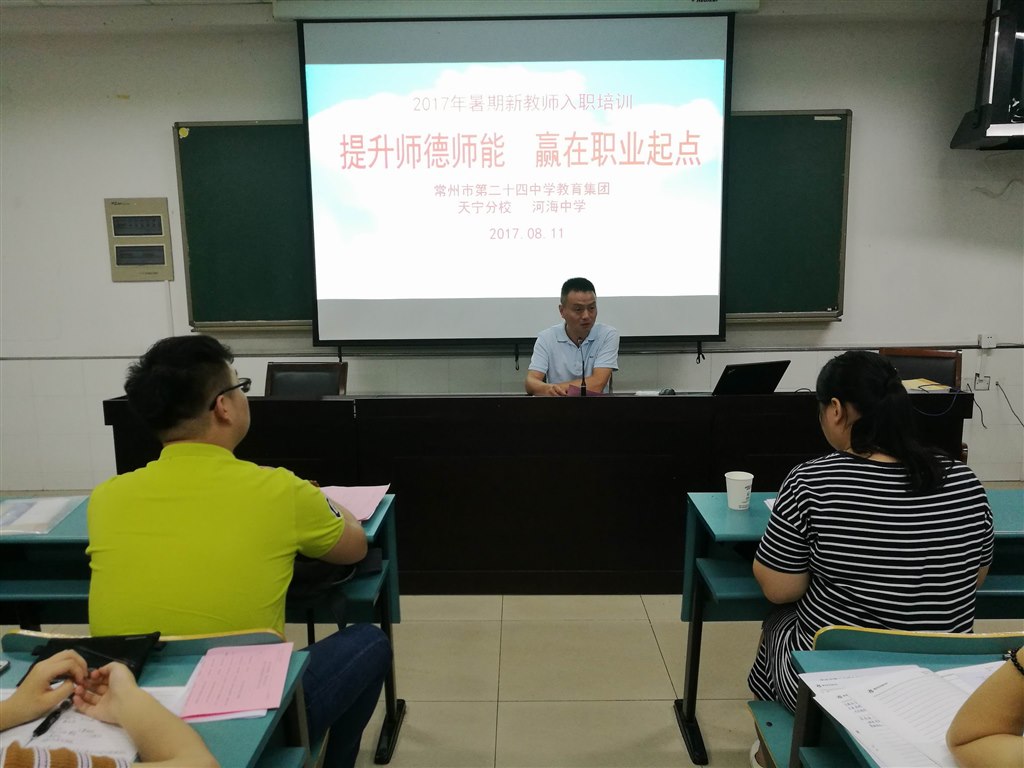 为帮助新教师尽快熟悉工作环境,融入工作氛围,快速完成职业角色的转变,08月10至11日,为期两天的常州市第二十四中学教育集团河海中学、天宁分校2017年暑期新教师入职培训在河海中学多功能室举行,来自两校今年新引进的二十四位新教师和近两年入职的五位教师共同参加了以“提升师德师能,赢在职业起点”为主题的培训。河海中学校长蒋顺国作开班动员,说明培训目的,介绍培训内容,提出培训要求。