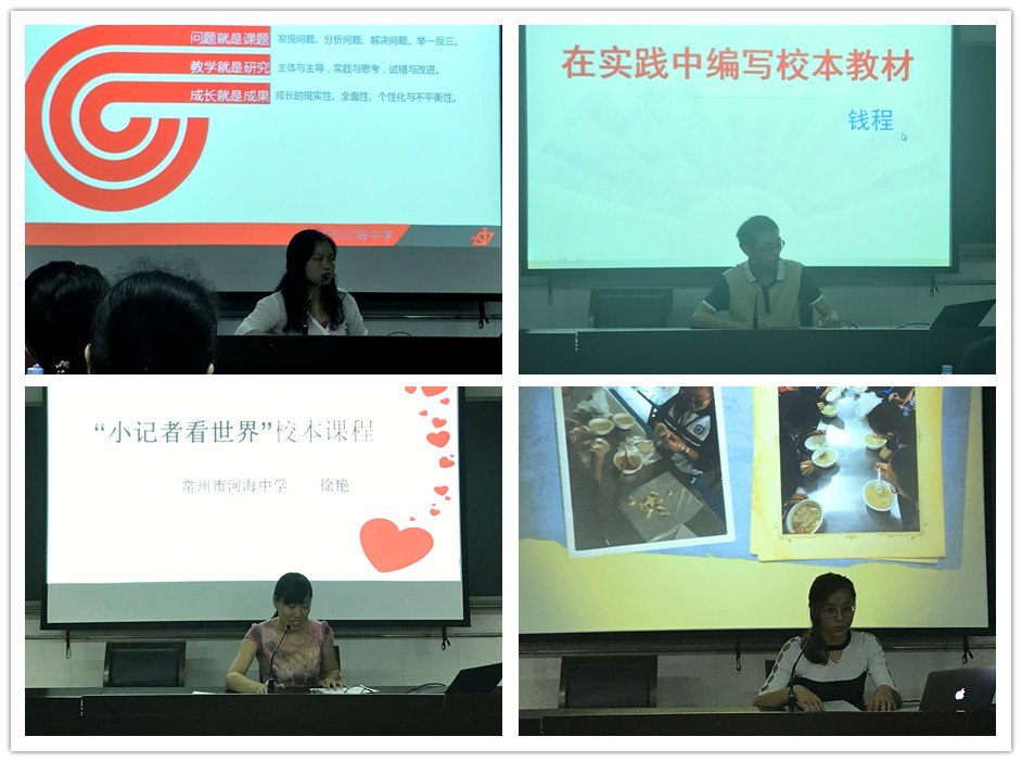 研讨会第二个议程交流了我校前期校本课程的开设经验。分别由四位教师代表发言:钱程老师详细解读了如何在实践中编写校本课程教材;马郁茜老师以《立足课程开发,推进课题研究》为题谈了课程与课题以及个人成长的关系;徐艳老师交流了“小记者看世界”校本课程的开设成果;陈菲老师总结了上学年开设“中西方饮食文化差异”课程的点滴经验。