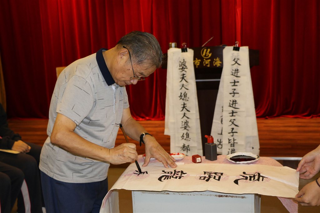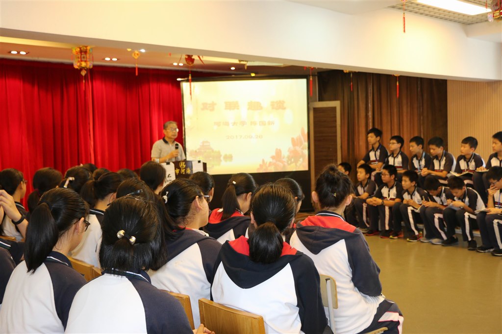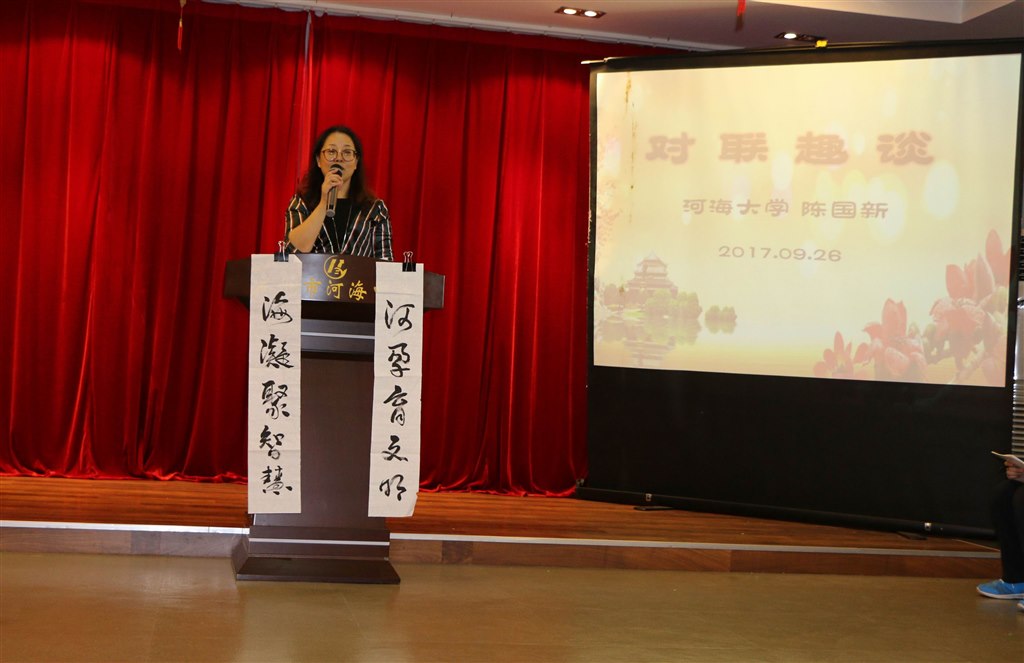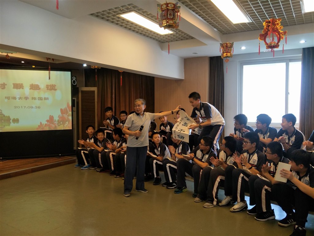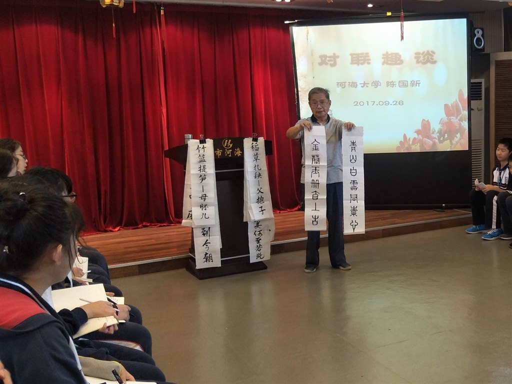 此次微型讲座有幸邀请到河海大学陈国新教授前来主讲。陈教授知识渊博、文化底蕴深厚,在楹联诗词方面有很深的造诣,他带领着同学们感受了中国传统文化的魅力。一副“河孕育文明,海凝聚智慧”对联拉开了讲座的序幕,调动了同学们的学习兴趣。随后,陈教授向我们介绍了对联的起源、分类、特点等,简析了对联在遣词造句方面的技巧,通过深入浅出的讲解和生动丰富的举例,使我们进一步了解了对联的基本知识。例如在讲座中,陈教授提到的这副对联“细雨肩头滴,青云足下生”,不仅让我们了解到它有趣的由来,也明确了对联的特点。说起对联的形成,那似乎是很玄妙的。对联的“对”,正是“生死离合、昼夜阴阳”,也正如鸟有对翅、人有双手、河有两岸。听到这里,我不禁感叹,文明源于自然,更是由智慧来创造。“小试牛刀”这一环节,现场同学踊跃发言,不时闪现智慧火花,妙趣横生,将整个活动推向了高潮。此次讲座内容涉及广泛,不仅有知识的介绍、方法的引领,还总结了一些关于人生的感悟,让我们获益匪浅,同学们纷纷表示这是一场高尚的艺术享受。最后,陈教授现场挥毫泼墨,书写了两幅对联赠与学校,笔锋刚劲,意蕴悠长。几位同学怀着激动的心情,小心翼翼地接过墨迹未干的对联,与陈教授合影留念。这场微型讲座在浓郁的文化氛围中结束了。