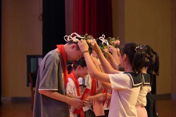 随后,优秀学生代表踮脚为助理们戴花环、敬队礼,画面温馨动人。