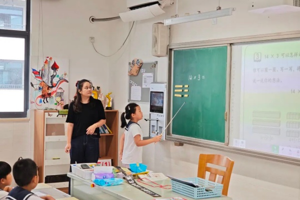 活动伊始,许芸婷老师以新教材为依托,带来了一堂生动且富有深度的《两、三位数乘一位数的笔算》展示课。在教学中,许老师立足 “新” 视角,注重算理的直观化与可视化呈现。在竖式教学环节,许老师更是突出“新”设计,通过“分步竖式”与“简洁竖式”的对比,引导学生自主发现竖式的简化逻辑。整个课堂既落实了算法教学,又深化了算理理解,展现了新教材背景下计算教学的新样态。不过,课堂实践中学生对“图形与算理结合”的理解仍存在障碍,也让我们直面新教材教学的真实挑战。